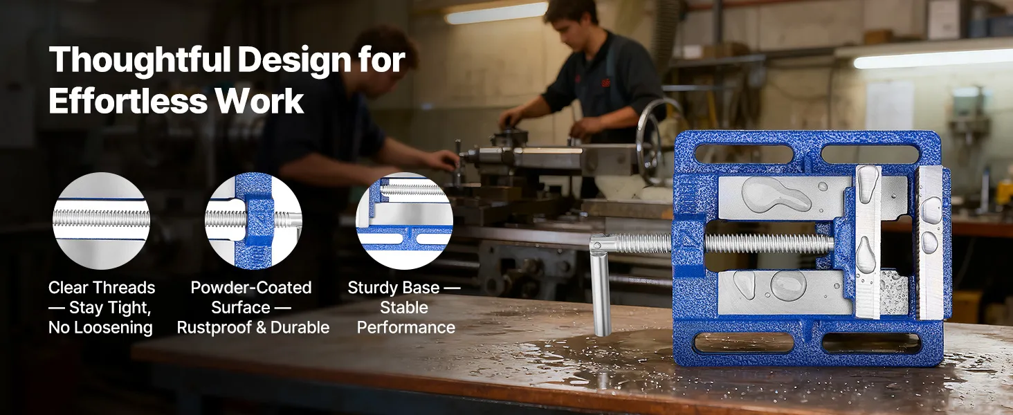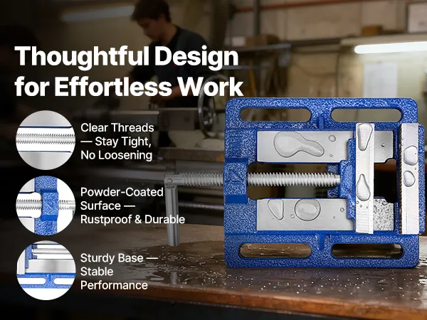 Uchwyt bez wysiłku: To żeliwne imadło wiertarskie posiada uchwyt bez wysiłku, który umożliwia łatwą regulację szczęk i zapewnia stabilny chwyt obrabianych przedmiotów o różnych rozmiarach i kształtach. Dzięki temu praca przebiega sprawniej i wydajniej.