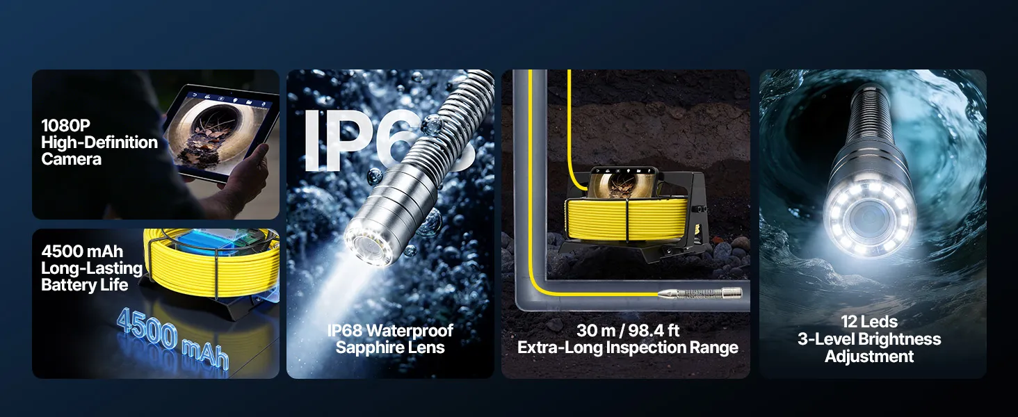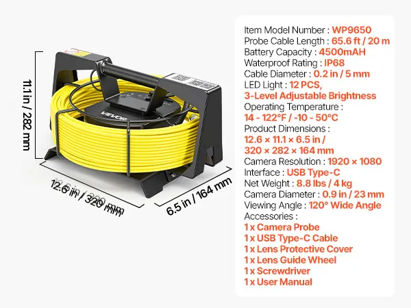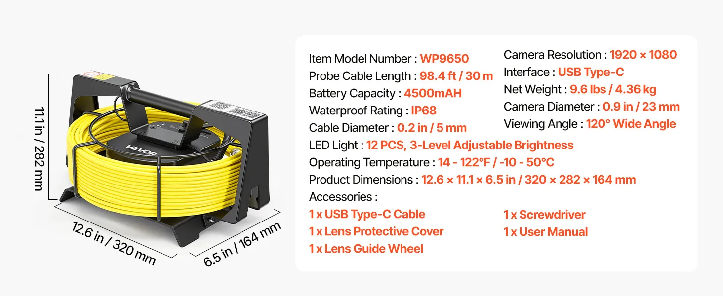Kamera endoskopowa VEVOR z Wi-Fi, kamera inspekcyjna 30 m z 12 diodami LED, oświetlenie 3-stopniowe, kamera do rur IP68 z baterią 4500 mAh i oznaczeniem miernika, kamera kanalizacyjna HD 1080p z obiektywem 120° do inspekcji drenażu