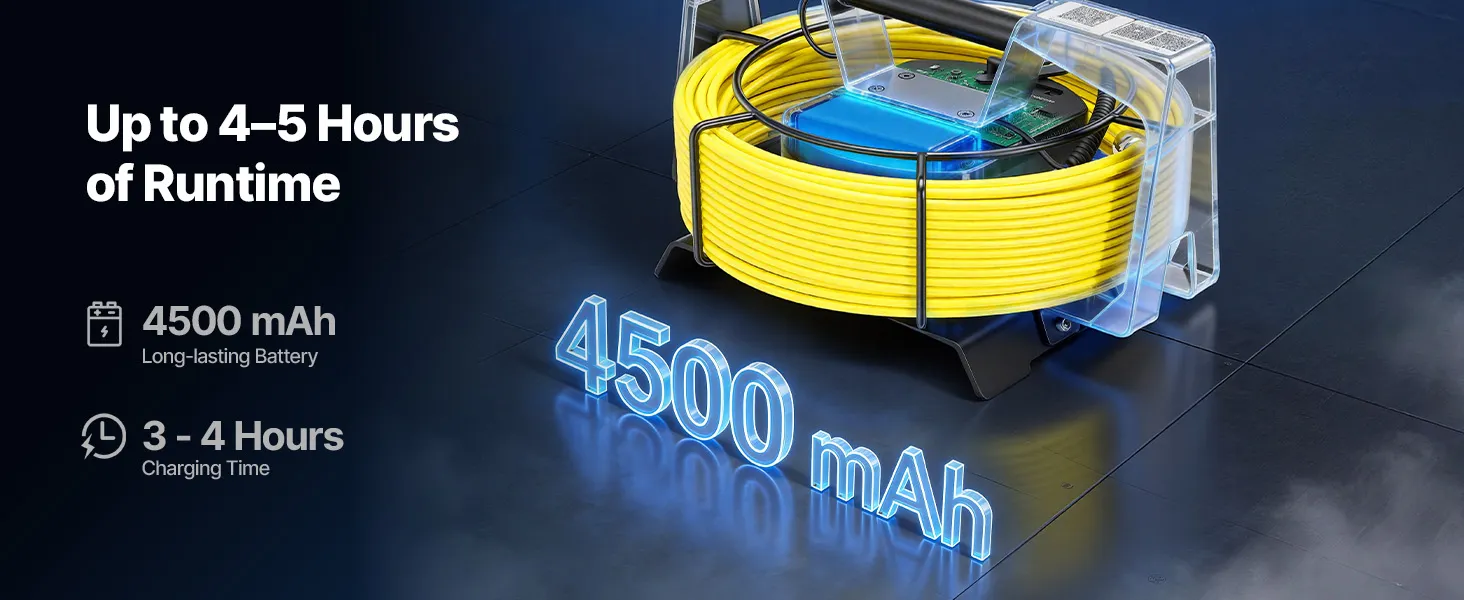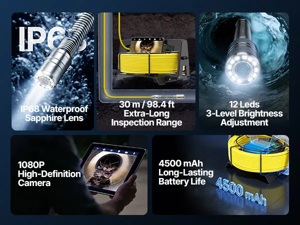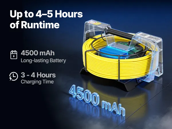 Regulowane oświetlenie i długi czas pracy na baterii: Wyposażony w 12 regulowanych diod LED z 3 poziomami jasności oraz baterię 4500 mAh, zapewniającą 4–5 godzin ciągłej pracy. Niezbędne narzędzie dla hydraulików, wykonawców i geodetów, którzy wymagają skutecznej diagnostyki rur.