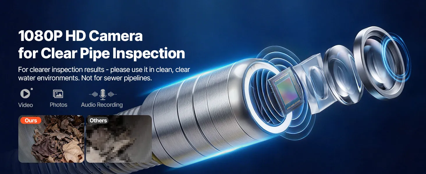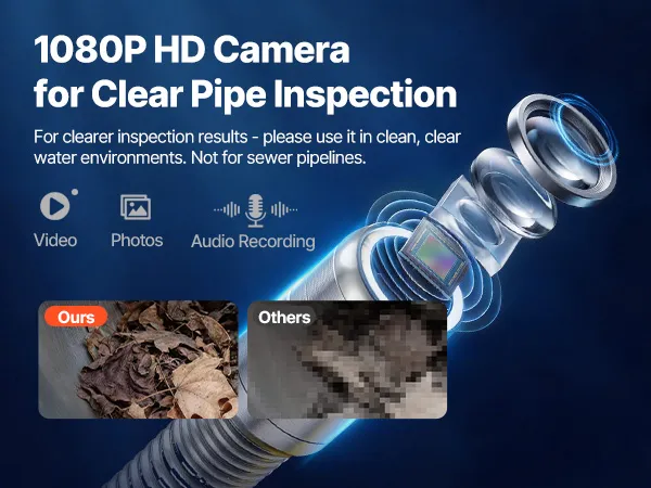 Wyraźna inspekcja HD: Wyposażona w obiektyw o wysokiej rozdzielczości 1920 x 1080 i szeroki kąt widzenia 120°, nasza kamera do inspekcji rur dostarcza wyraźne, szczegółowe obrazy i szersze pole widzenia, dzięki czemu podczas inspekcji można z łatwością zobaczyć więcej wnętrza rury.