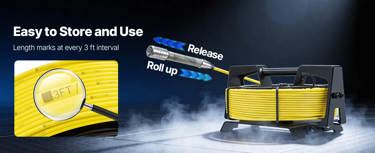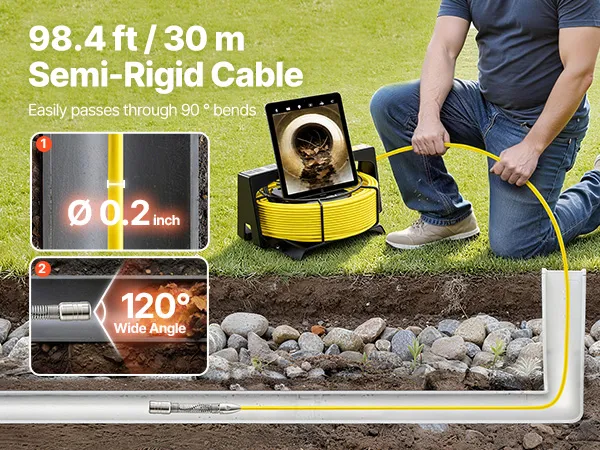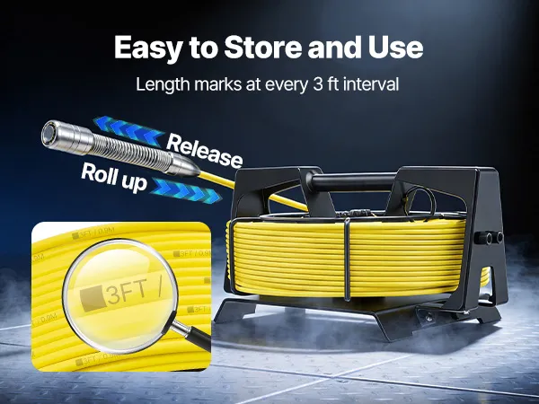 Wszechstronne zastosowania: Ta kamera inspekcyjna rur jest wyposażona w solidny metalowy bęben, który ułatwia transport. Idealna do inspekcji rurociągów basenowych, rur odpływowych oraz konserwacji systemów ogrzewania, wentylacji i klimatyzacji. Kompatybilne średnice rur: Rury proste: 25–150 mm (0,99–5,9 cala); Rury kątowe: 50–150 mm (1,97–5,9 cala).