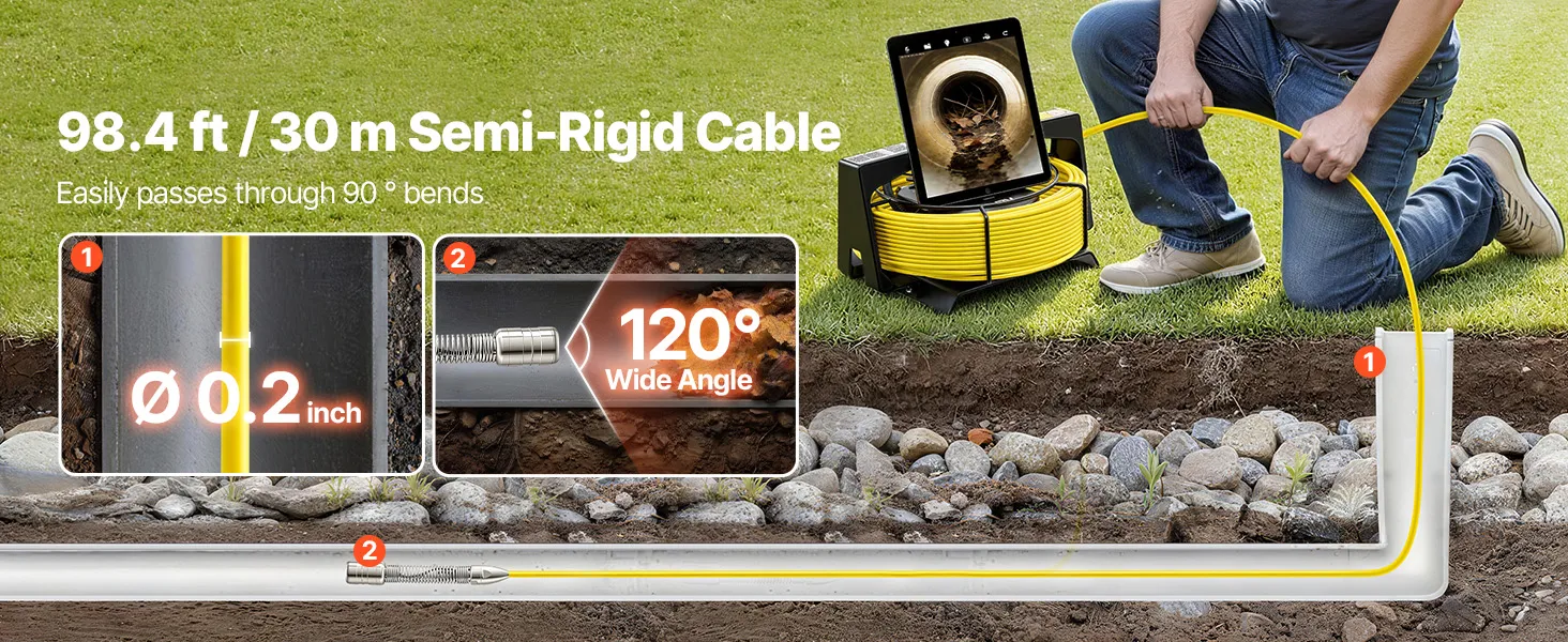 Wytrzymały, półsztywny kabel: Ta kamera do rur jest wyposażona w 30-metrowy, półsztywny kabel światłowodowy o grubości 5 mm z klasą wodoodporności IP68. Zapewnia on doskonałą przepustowość i trwałość, umożliwiając płynne przechodzenie przez zakręty i długie rury bez pęknięć lub rozdarć.
