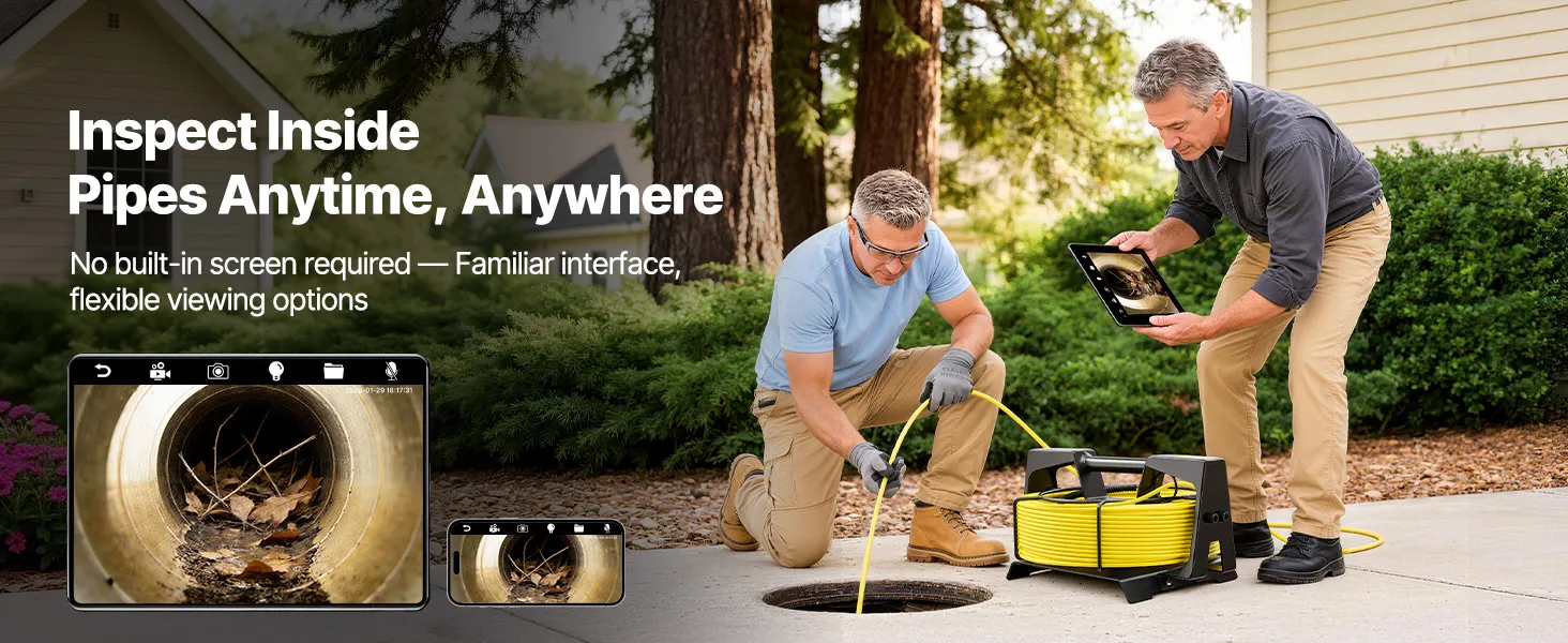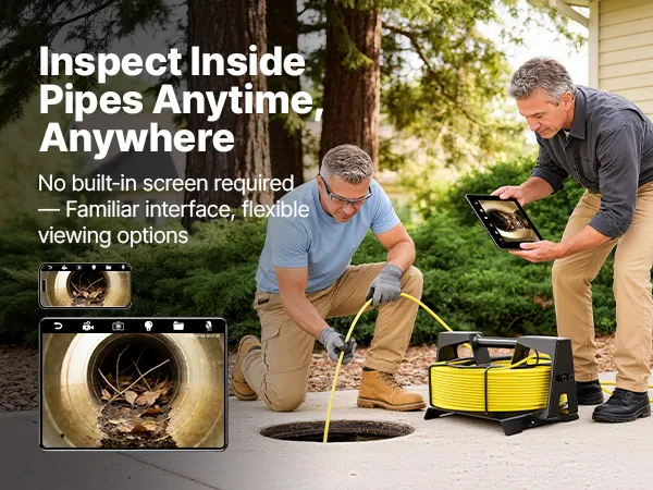 Dzięki zintegrowanemu Wi-Fi ta kamera kanalizacyjna łączy się bezpośrednio ze smartfonem lub tabletem, eliminując potrzebę używania nieporęcznych monitorów. Inspekcja rur w czasie rzeczywistym, robienie zdjęć lub nagrywanie filmów z dźwiękiem, zapisywanie danych i udostępnianie plików bezpośrednio z urządzenia mobilnego.
