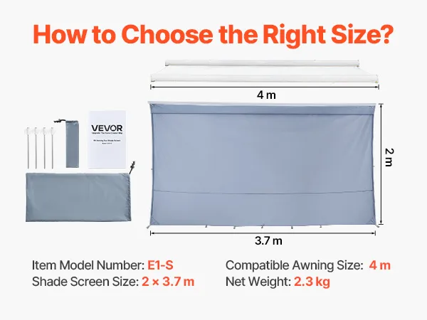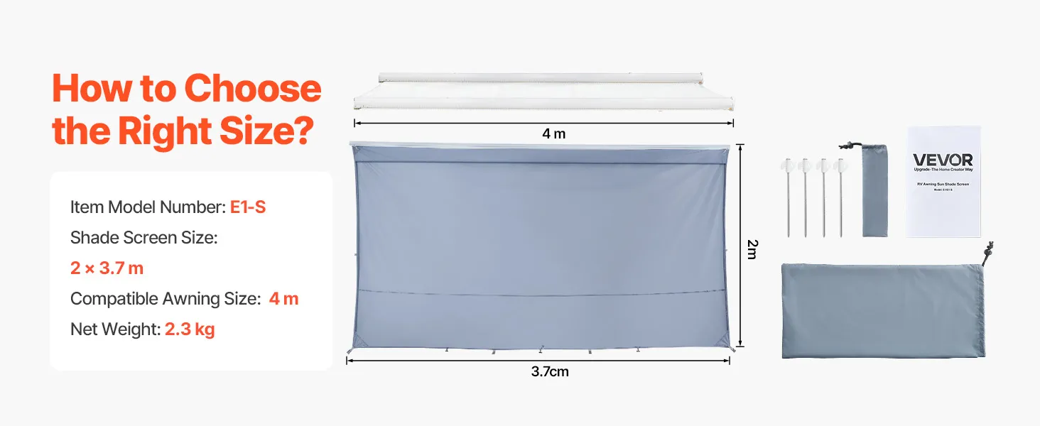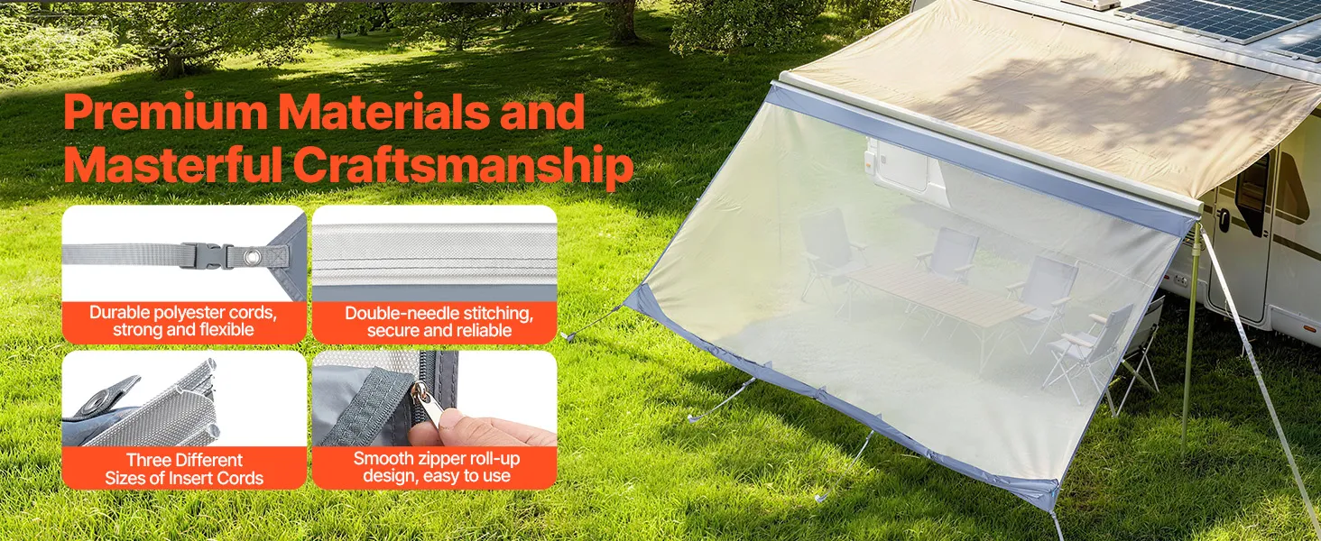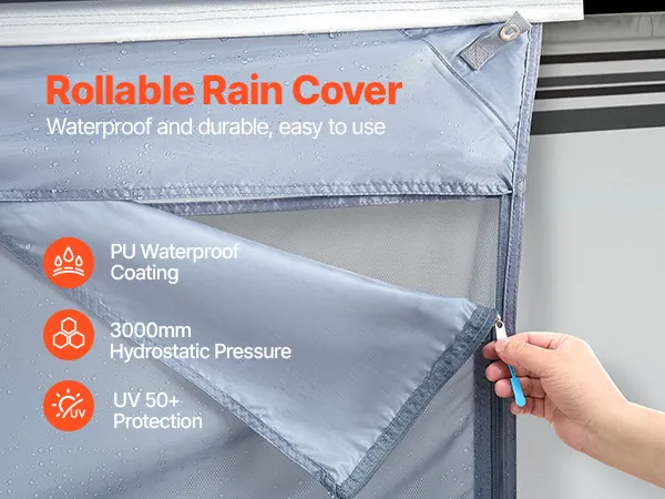 Osłona przeciwsłoneczna VEVOR (2 x 3,7 m) do markiz (4 m), przedni panel markizy z powłoką UV50+, zapinaną na zamek błyskawiczny, z podwójnie szytą siateczką poliestrową, osłona przeciwdeszczowa do kamperów, przyczep kempingowych i kempingowych