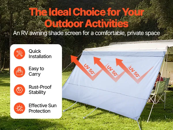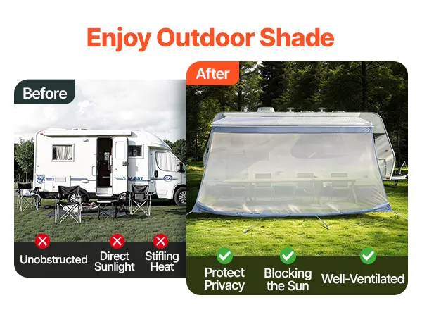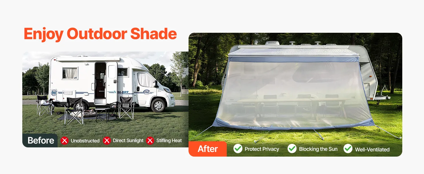 Stwórz zacienioną i wygodną przestrzeń na zewnątrz podczas kempingu w kamperze, redukując bezpośrednie światło słoneczne, minimalizując upał i zapewniając dobrą cyrkulację powietrza, aby zapewnić przyjemniejsze spędzanie czasu na świeżym powietrzu. Wymiary markizy: 2 x 3,7 m, kompatybilna z markizami o szerokości 4 m.