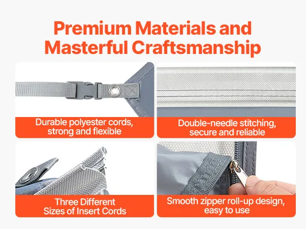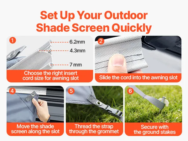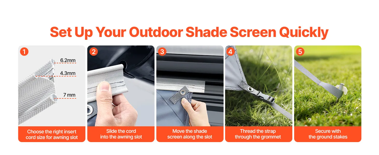 Łatwy montaż: Trzy paski kederowe o różnych średnicach (4,3 mm / 6,2 mm / 7 mm) można wsunąć w różne prowadnice markizy, co zapewnia bezpieczne mocowanie. Torby do przechowywania pozwalają zaoszczędzić miejsce i wygodnie transportować.