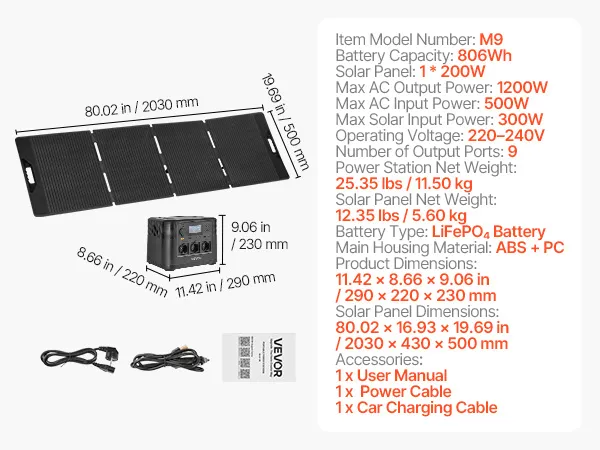 Przenośna elektrownia VEVOE z panelem słonecznym o mocy 200 W, generatorem słonecznym o mocy 1200 W, akumulatorem LiFePO4 o pojemności 806 Wh i 9 wyjściami, awaryjny generator energii do domu, na kemping i do podróży kamperem