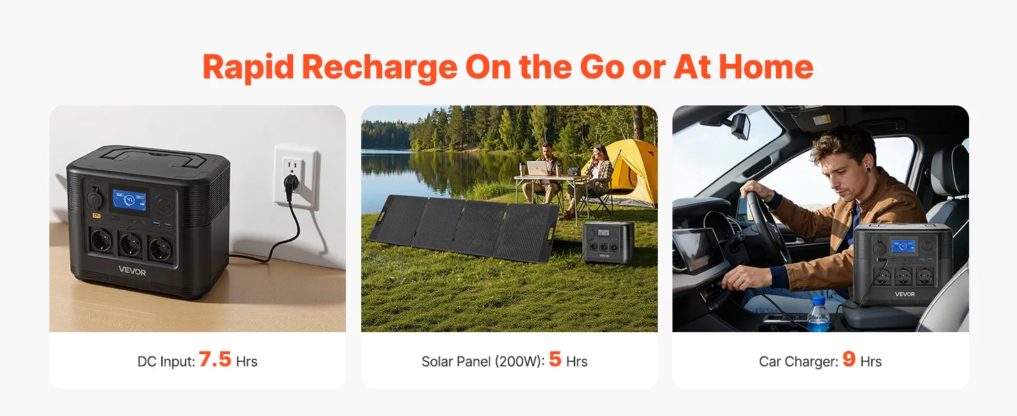 • Wiele opcji ładowania: Panel słoneczny o mocy 200 W efektywnie ładuje elektrownię czystą energią, wykorzystując światło słoneczne do pełnego naładowania w około 5 godzin. Alternatywnie, ładowanie z gniazdka ściennego trwa około 7,5 godziny, a w samochodzie około 9 godzin.