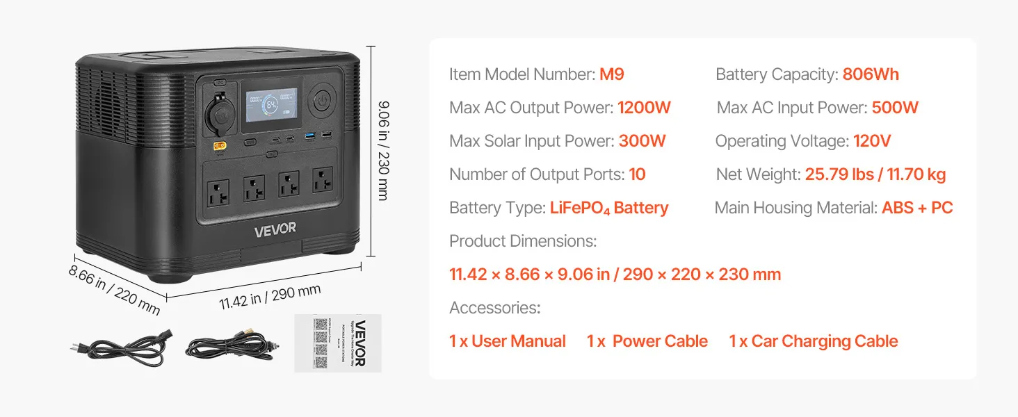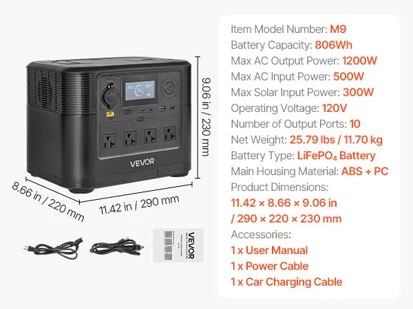 VEVOR Portable Power Station, 1200W Solar Generator Power Station, 806Wh LiFePO4 Battery Backup with 9 Output Ports for Home Emergency, Outdoor Camping, RV Travel (Solar Panel NOT Included)