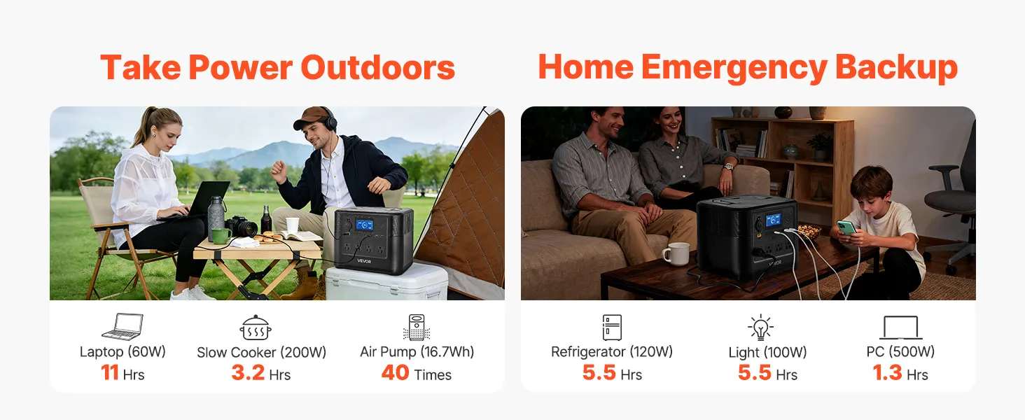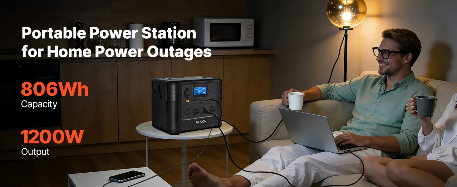 Reliable Portable Power: Enjoy a stable power supply for home backup or outdoor adventures with this 1200W 806Wh portable power station. It can simultaneously power mobile phones, car refrigerators, speakers, and cameras during camping for about 9 hours