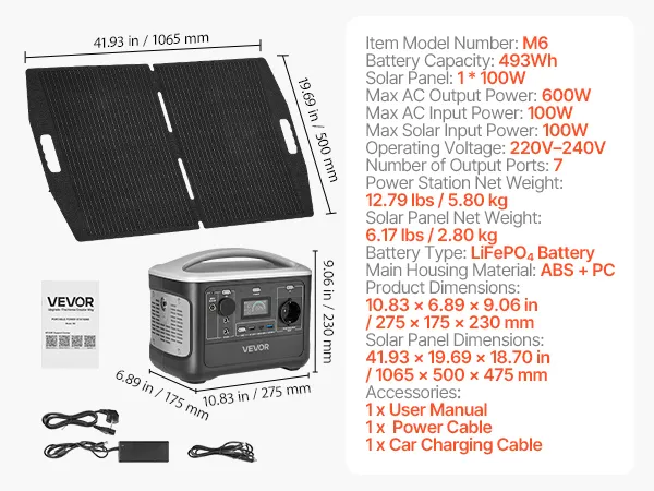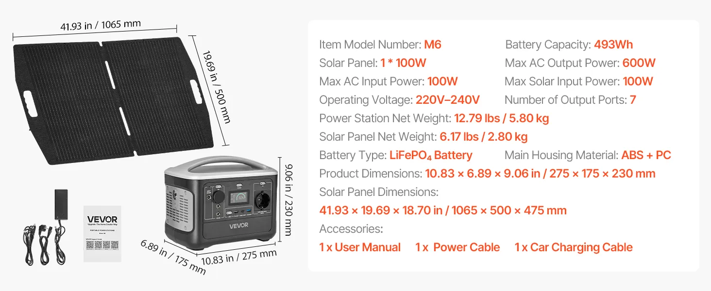Przenośna elektrownia VEVOR z panelem słonecznym o mocy 100 W, generatorem słonecznym o mocy 600 W, akumulatorem LiFePO4 o pojemności 493 Wh i 7 wyjściami, awaryjny generator energii, idealny na wypadek awarii w domu, na kempingu i w kamperze