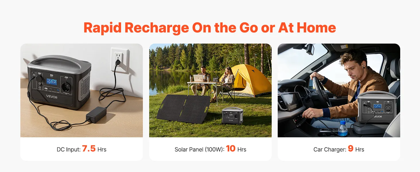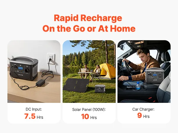 Wiele opcji ładowania: Panel słoneczny o mocy 100 W efektywnie ładuje elektrownię czystym światłem słonecznym, co zajmuje około 10 godzin. Alternatywnie, można go również ładować z gniazdka ściennego (około 7,5 godziny) lub w samochodzie (około 9 godzin).