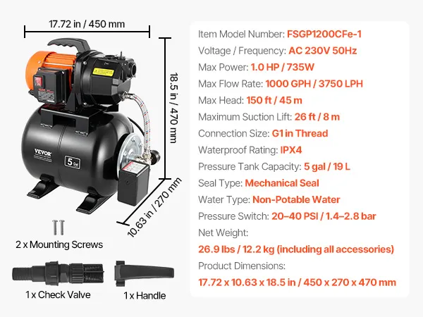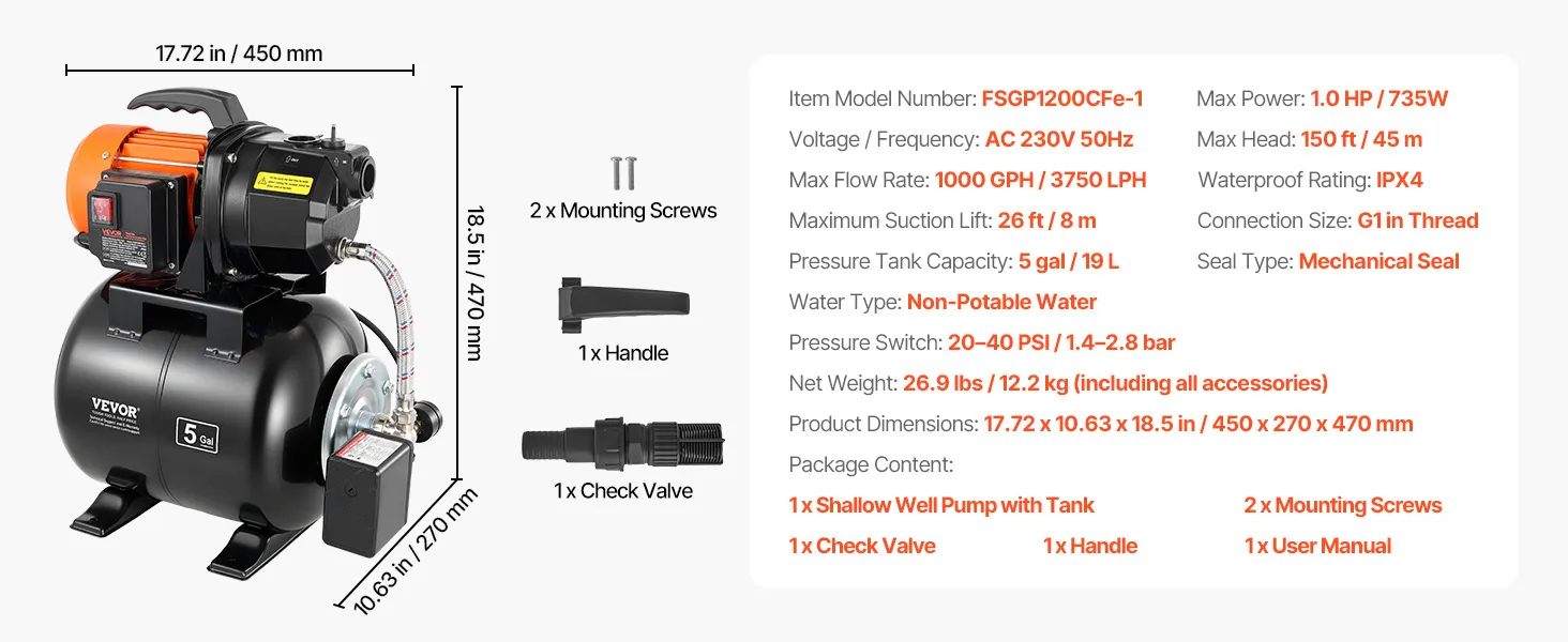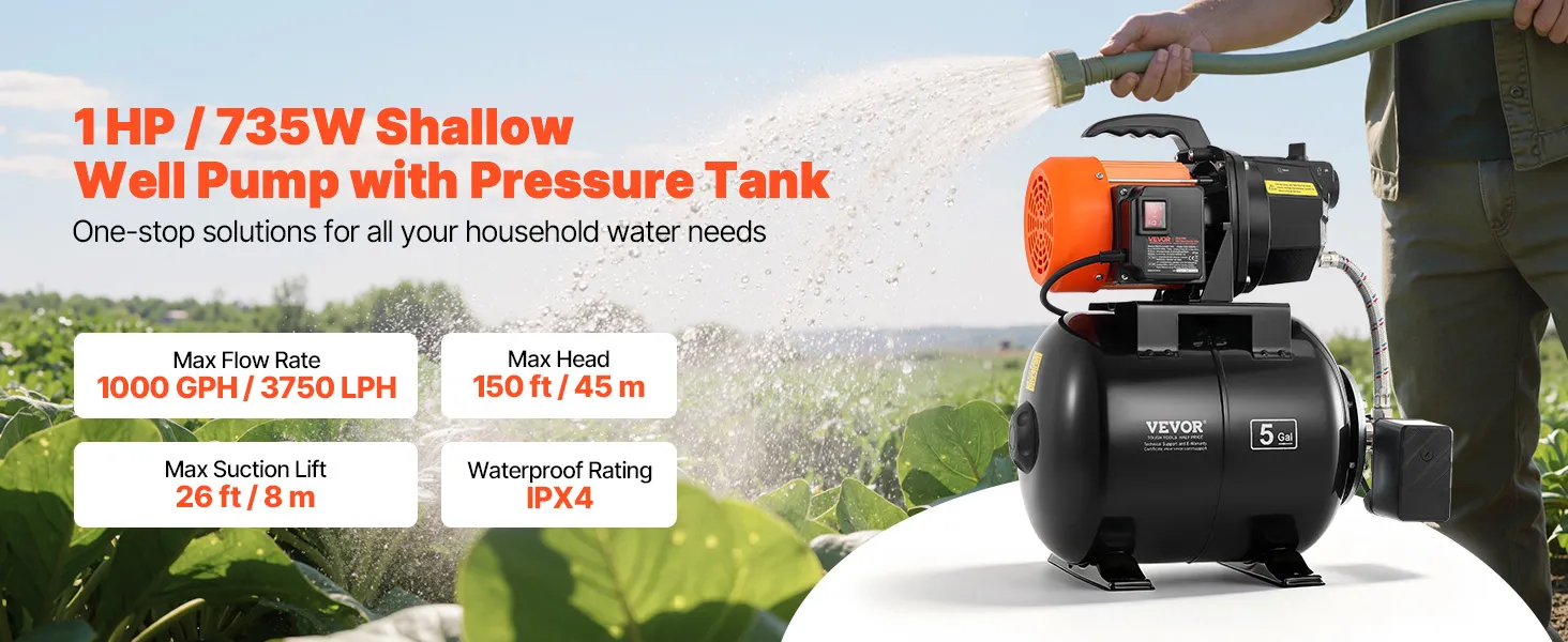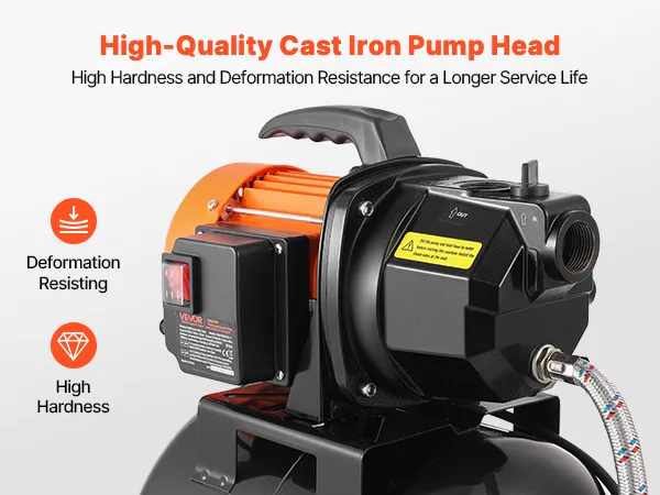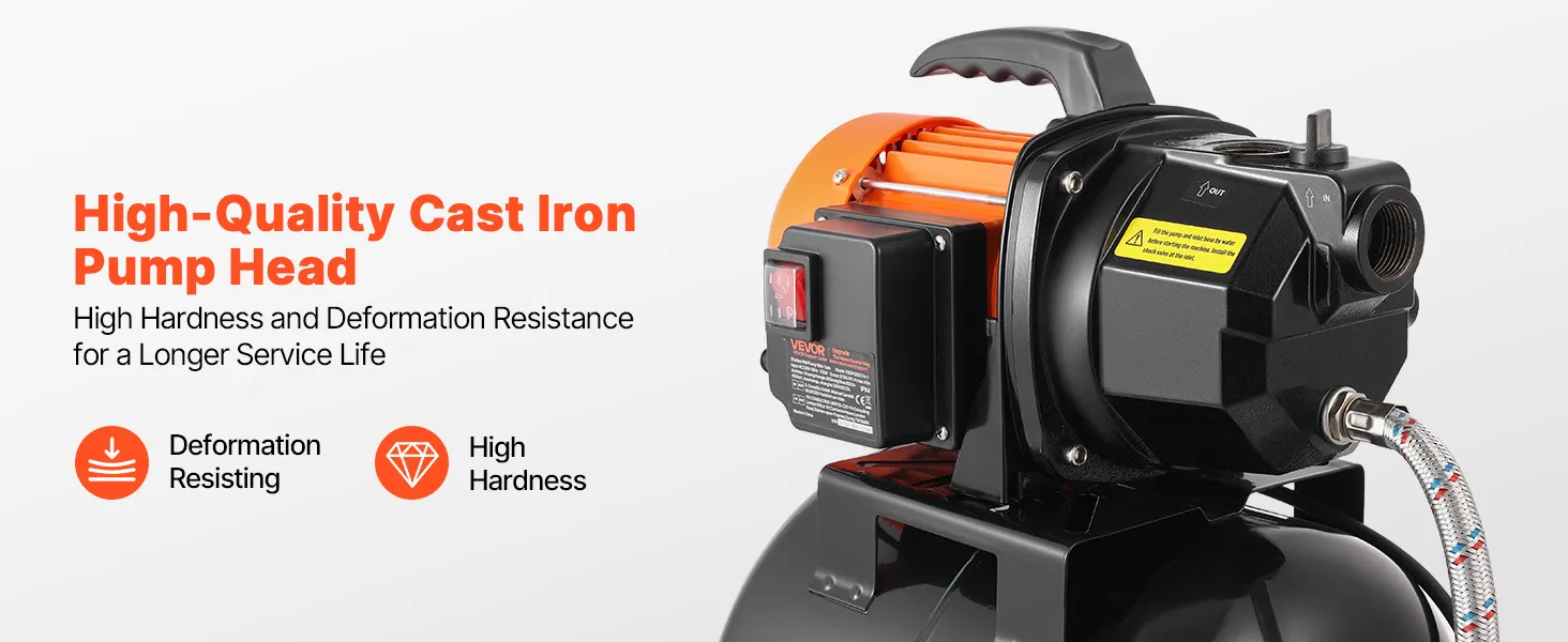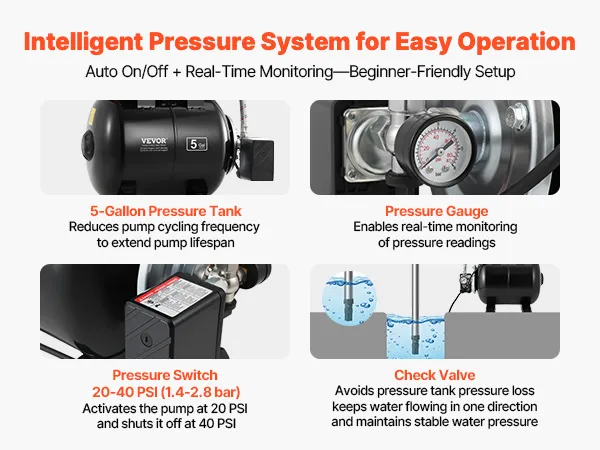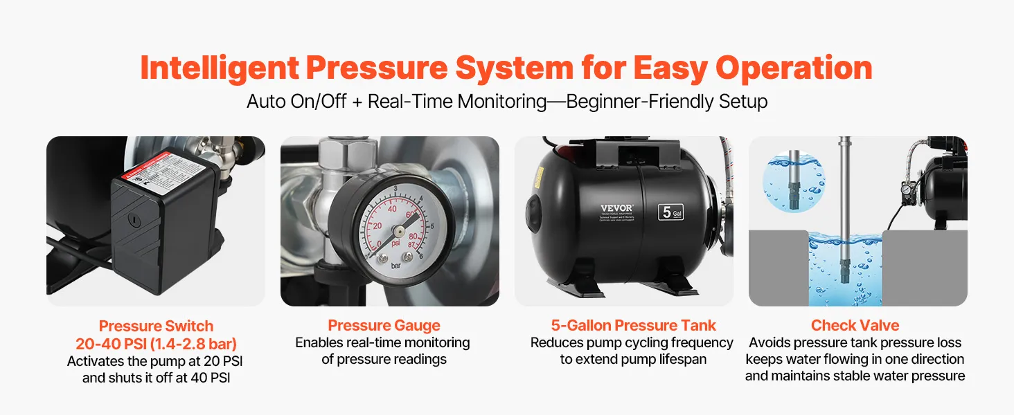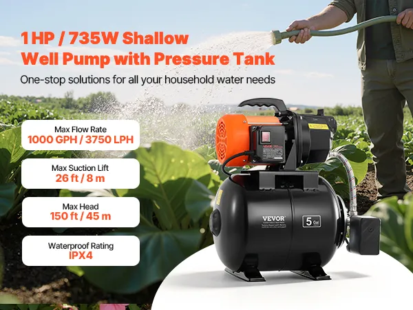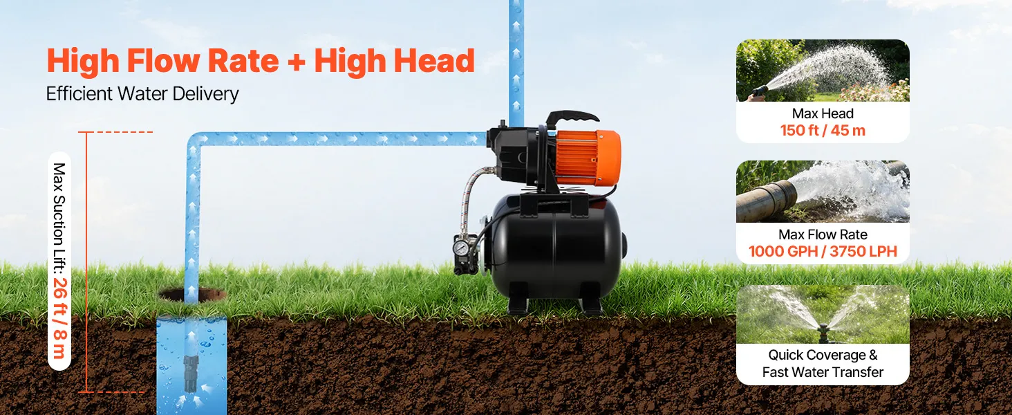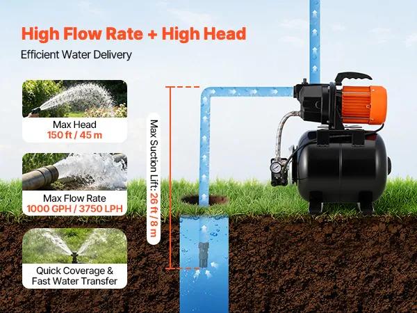 • Pompa o wysokiej wydajności: Ten domowy system zaopatrzenia w wodę zapewnia wydajność do 3750 l/h (1000 galonów na godzinę) i maksymalną wysokość podnoszenia 45 m (150 stóp), bez problemu radząc sobie z nawadnianiem dużych ogrodów i trawników. Jednocześnie zapewnia wystarczające ciśnienie wody dla gospodarstwa domowego.