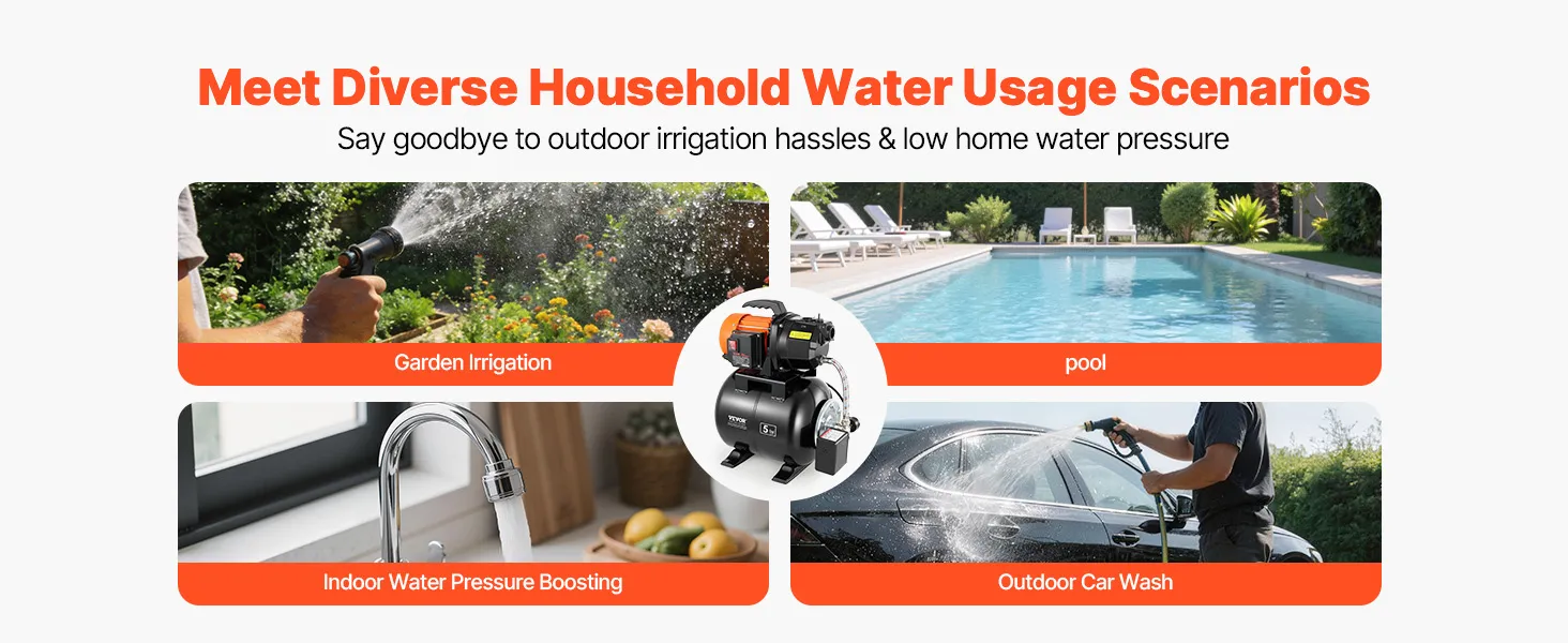 Od nawadniania ogrodu po rolnictwo, ten domowy system zaopatrzenia w wodę z zasobnikiem ciśnieniowym oferuje stabilną wydajność i łatwą obsługę. Pożegnaj niskie ciśnienie wody i skomplikowaną instalację. Zapewnij sobie niezawodne zaopatrzenie w wodę do codziennych potrzeb.