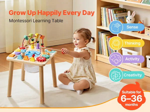 Nauka Montessori dla wszystkich zmysłów: Ten stolik edukacyjny Montessori łączy kształty, faktury i dźwięki dla dzieci od 6. miesiąca życia! Każdy dotyk wspomaga koordynację wzrokowo-ruchową, pierwsze słowa i percepcję wzrokową – kto by pomyślał, że nauka może być tak przyjemna?
