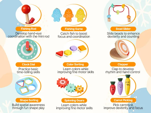 Ten stolik do zabawy łączy w sobie sortowanie kolorów i kształtów, grę w łowienie ryb, labirynt koralików, obracające się koła zębate, ruchomą wskazówkę zegara, zbieranie marchewek i podkładkę do nauki rytmu. Kolorowe elementy i funkcja stukania zachęcają do koncentracji, wyobraźni i kreatywnego opowiadania historii.