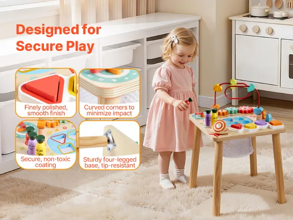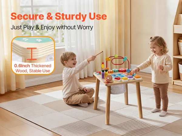 Ten stolik zabawowy wykonany jest z drewna o grubości 1,5 cm i ma przyjazną dla dzieci, bezzapachową powierzchnię. Dzięki solidnej konstrukcji jest odporny na wstrząsy i chwianie, dzięki czemu dzieci mogą bawić się bez obaw, a rodzice mogą spać spokojnie.