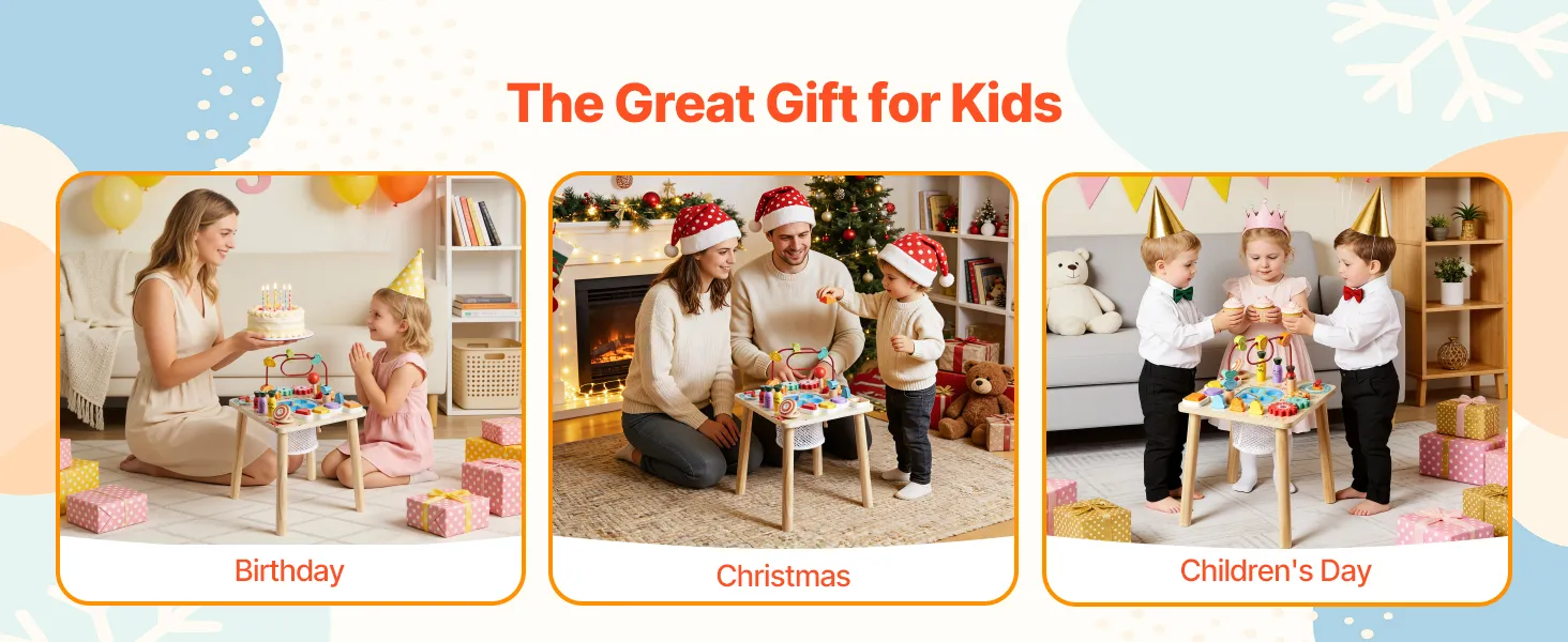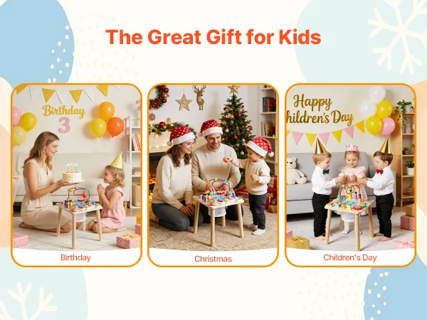 Zabawy i gry na prezent: Nasz stolik z zabawkami dla maluchów zachęca dzieci do wydawania dźwięków, wymyślania historii, dzielenia się uczuciami i puszczania wodzy fantazji – uśmiechnięte twarze gwarantowane! Kto jest gotowy na kolejne małe arcydzieło?