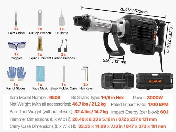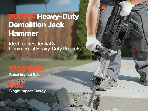 Silnik o wysokiej wydajności: dzięki silnikowi o mocy 3000 W i częstotliwości do 1700 uderzeń na minutę ten młot wyburzeniowy szybko i wydajnie radzi sobie z ciężkimi zadaniami – idealny do użytku domowego i projektów komercyjnych