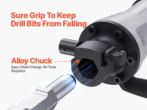 Ergonomiczna konstrukcja: Regulowany w zakresie 360° uchwyt młota pneumatycznego zapewnia optymalne ustawienie i kontrolę, zmniejszając zmęczenie podczas długotrwałego użytkowania. Bezpieczny i wygodny uchwyt gwarantuje stabilność nawet w trudnych warunkach.