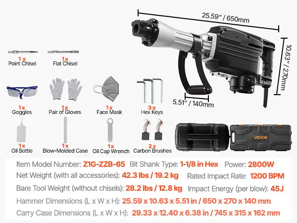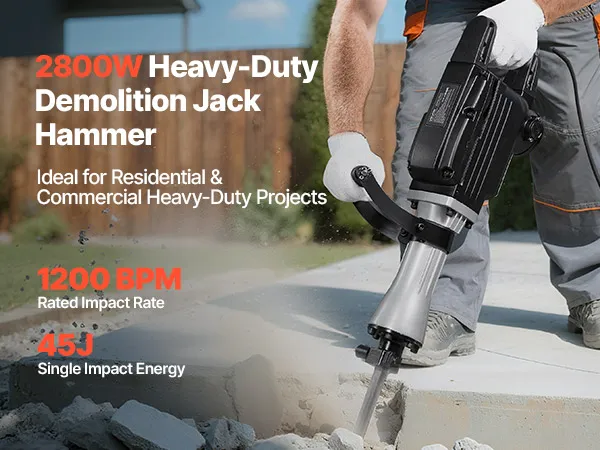 Silnik o wysokiej wydajności: dzięki silnikowi o mocy 2800 W i częstotliwości do 1200 uderzeń na minutę ten młot wyburzeniowy szybko i wydajnie radzi sobie z ciężkimi zadaniami – idealny do użytku domowego i projektów komercyjnych