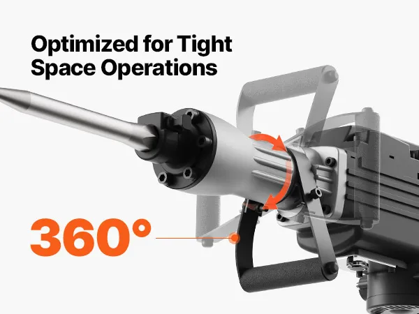 Rękojeść elektrycznego młota wyburzeniowego została zaprojektowana tak, aby dopasować się do naturalnego kształtu dłoni. Zintegrowane funkcje amortyzacji wstrząsów redukują wibracje. Urządzenie jest wygodne podczas długotrwałego użytkowania, a wielokątowa regulacja minimalizuje wysiłek, ułatwiając ciągłą pracę.