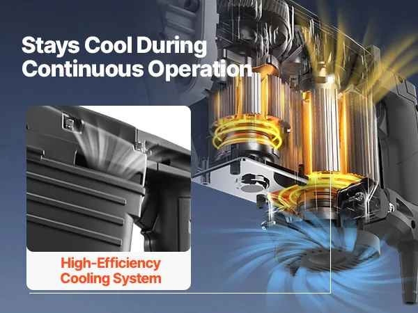 Wydajne chłodzenie: Wbudowany układ chłodzenia zapewnia pracę silnika w niższych temperaturach, co wydłuża żywotność młota pneumatycznego do betonu i gwarantuje niezawodną pracę podczas długich prac rozbiórkowych