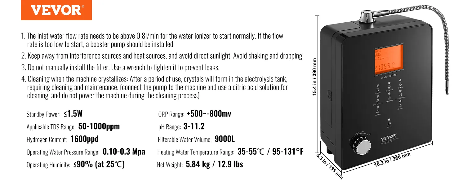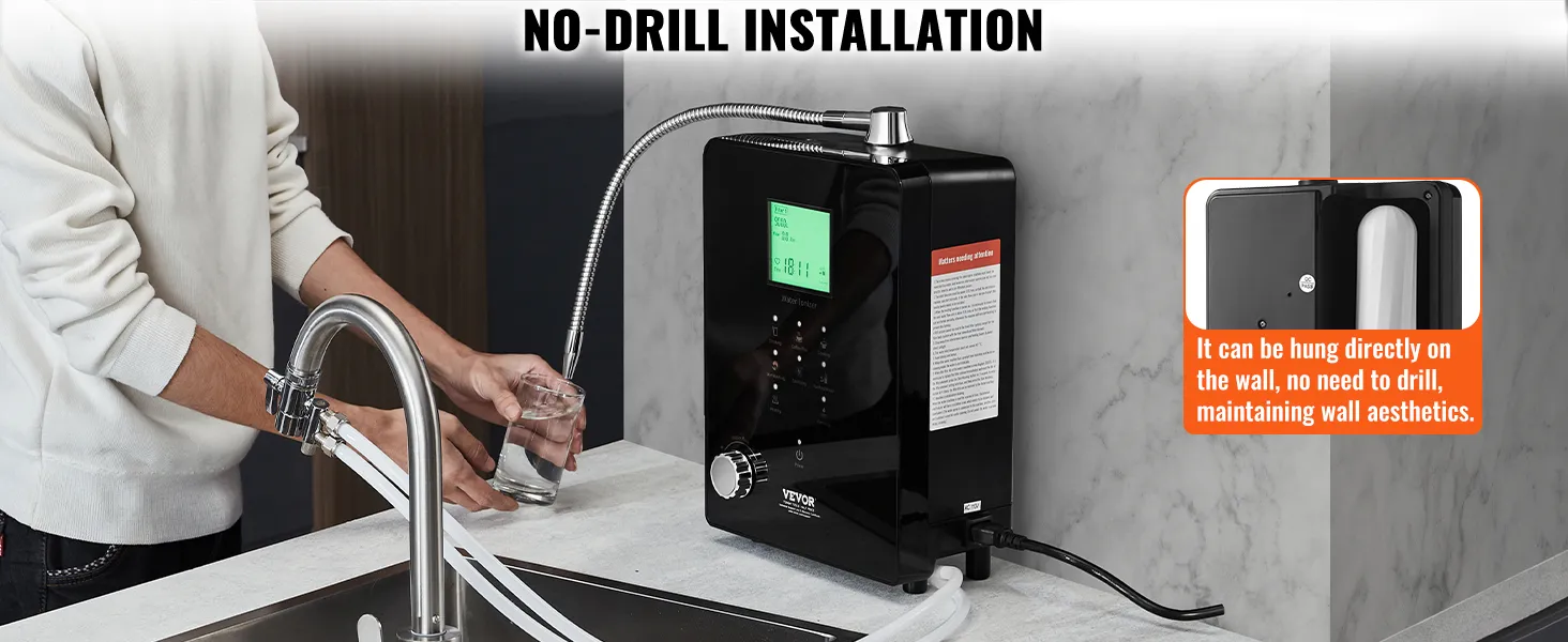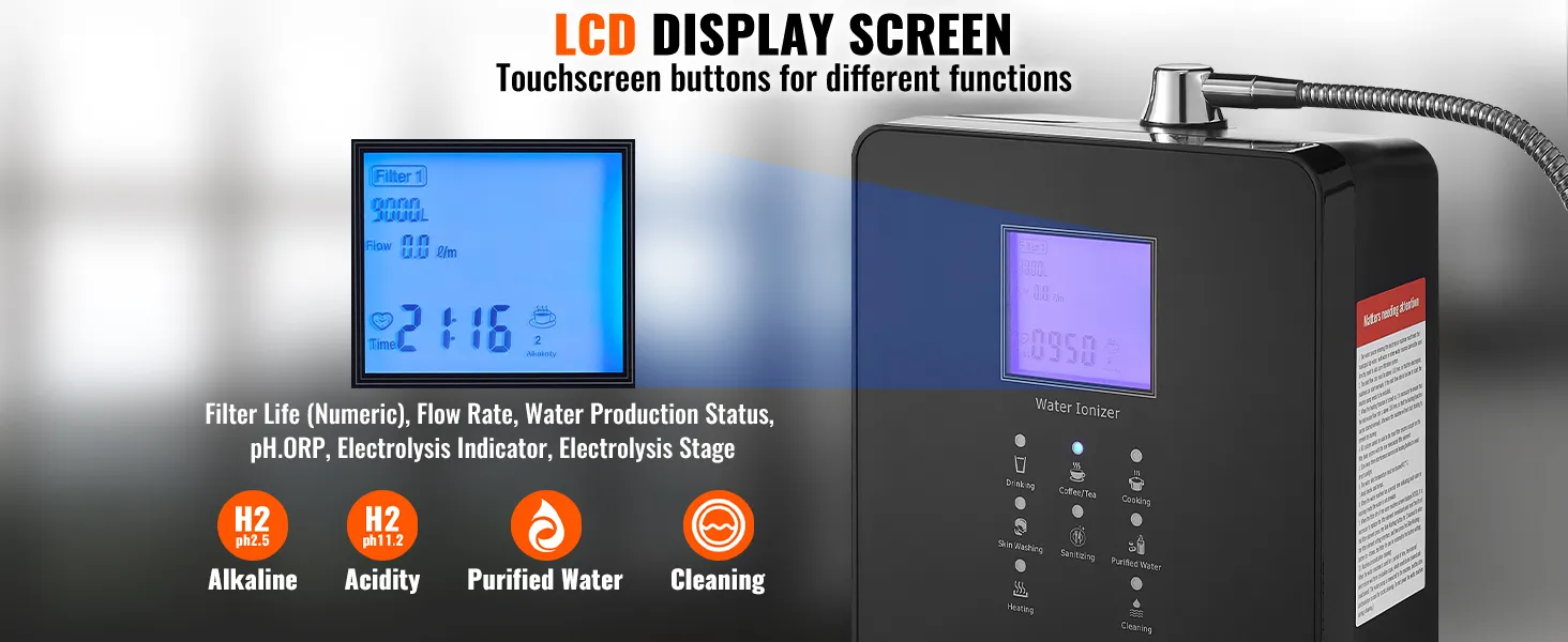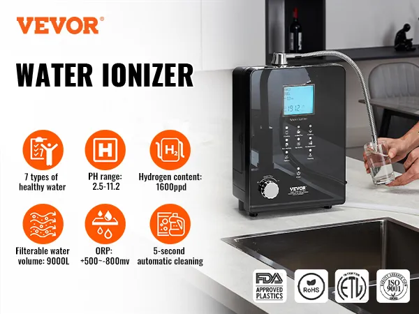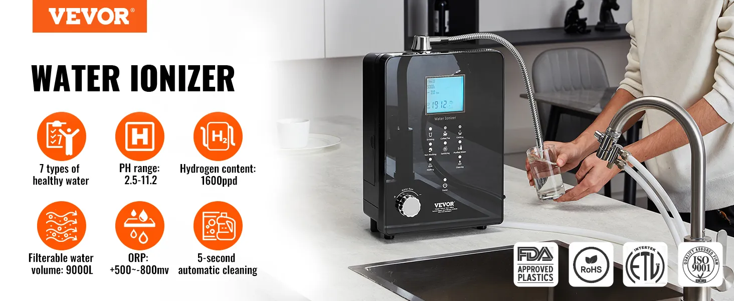 Wszechstronny: Ten alkaliczny jonizator wody ma zakres pH od 3 do 11,2, zakres ORP od +500 do -800 mV, zawartość wodoru 1600 ppd i zakres podgrzewania wody od 95 do 131°F (35-55°C). System może wytwarzać 6 różnych rodzajów wody, w tym wodę użytkową, wodę alkaliczną, wodę kwaśną i wodę oczyszczoną. Dzięki temu nadaje się do mycia owoców i warzyw, pielęgnacji skóry, gotowania, sprzątania oraz produkcji wody elektrolizowanej.