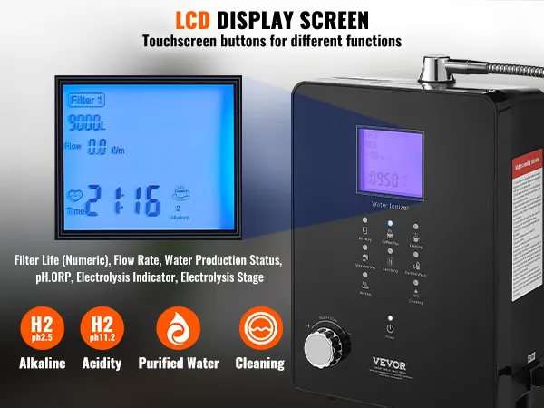 VEVOR Alkaliczny filtr do wody kwaśnej, pH 3-11,2, 6 trybów, domowy filtr do wody alkalicznej, jonizator wody +500-800 mV, filtr do wody o pojemności 9000 l, do użytku domowego, czarny