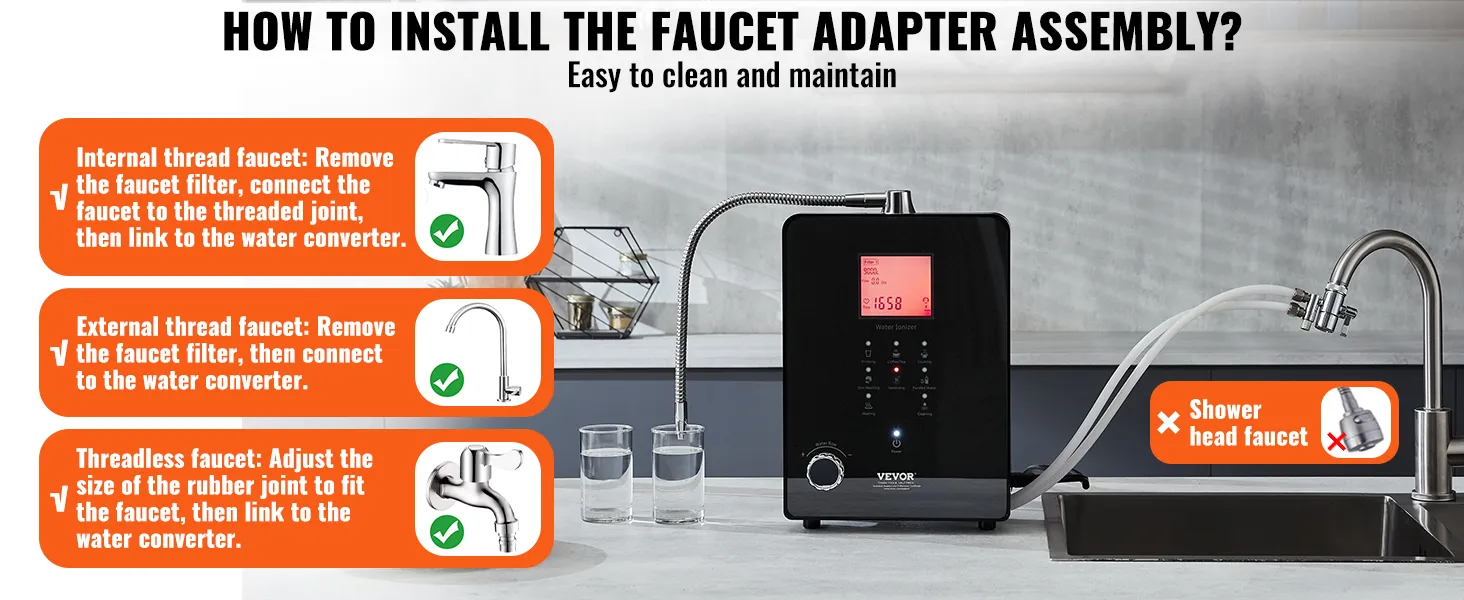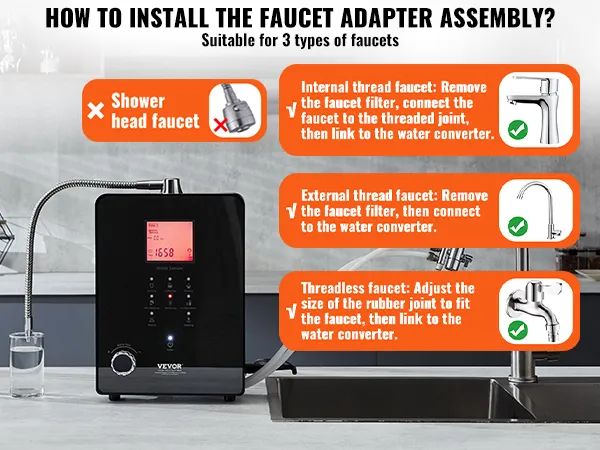 Jonizator wody jest wyposażony w adapter, dzięki czemu jest kompatybilny z trzema rodzajami kranów: kranami z gwintem wewnętrznym, kranami z gwintem zewnętrznym i kranami bez gwintu.