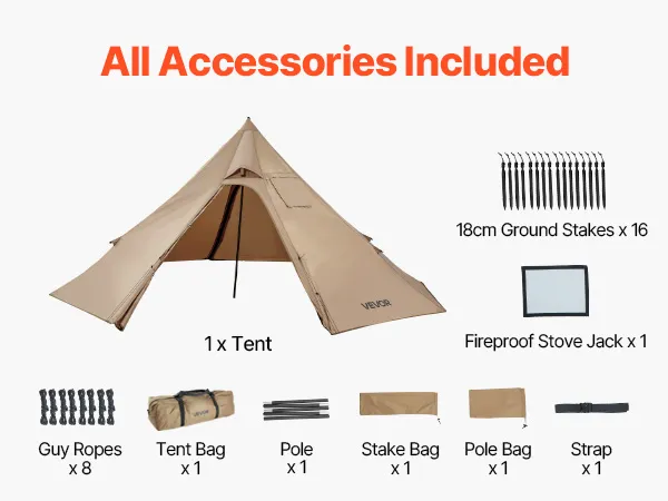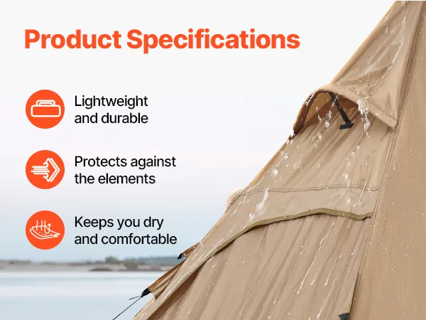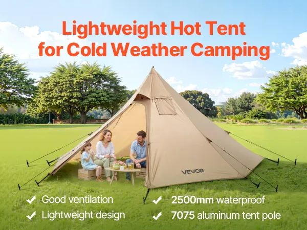 Ciepły namiot całoroczny: Ten namiot tipi idealnie nadaje się na kemping rodzinny i grupowy. Wyposażony w trudnopalne przyłącze do kuchenki, co pozwala na całoroczne użytkowanie, ten ciepły namiot tipi sprawia, że biwakowanie w chłodne dni jest łatwe i wygodne.