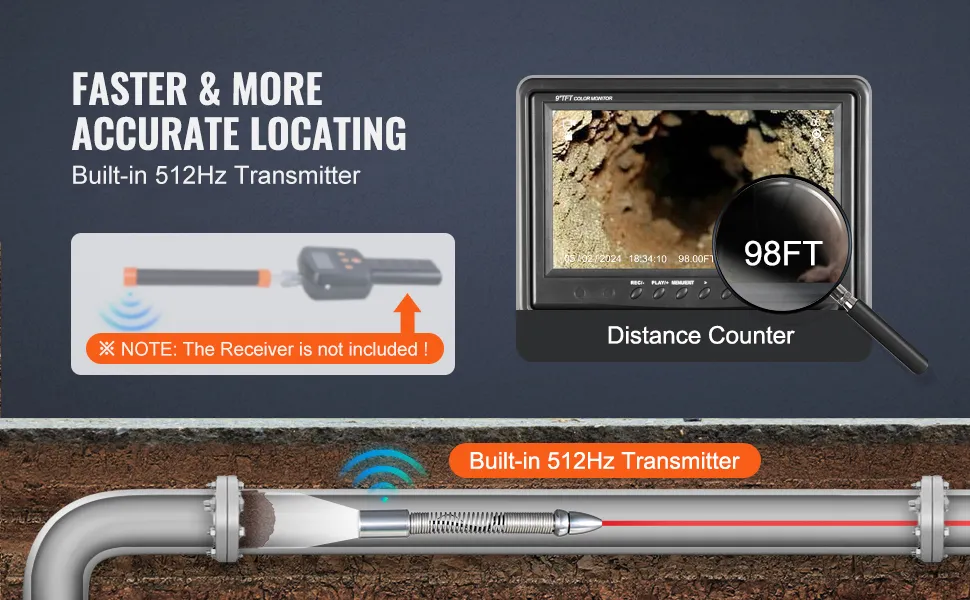 Precyzyjne lokalizowanie i wyświetlanie odległości: Kamera kanalizacyjna VEVOR o zasięgu 30 m (98 stóp) jest wyposażona we wbudowany nadajnik sondy 512 Hz, który umożliwia precyzyjne śledzenie lokalizacji. Licznik odległości na ekranie mierzy długość kabla w kanale, umożliwiając szybką lokalizację problemów za pomocą lokalizatora (brak w zestawie). Kompatybilne średnice rur: rury proste: Φ 0,99–5,90 cala / 25–150 mm; rury kątowe: Φ 1,97–5,90 cala / 50–150 mm.