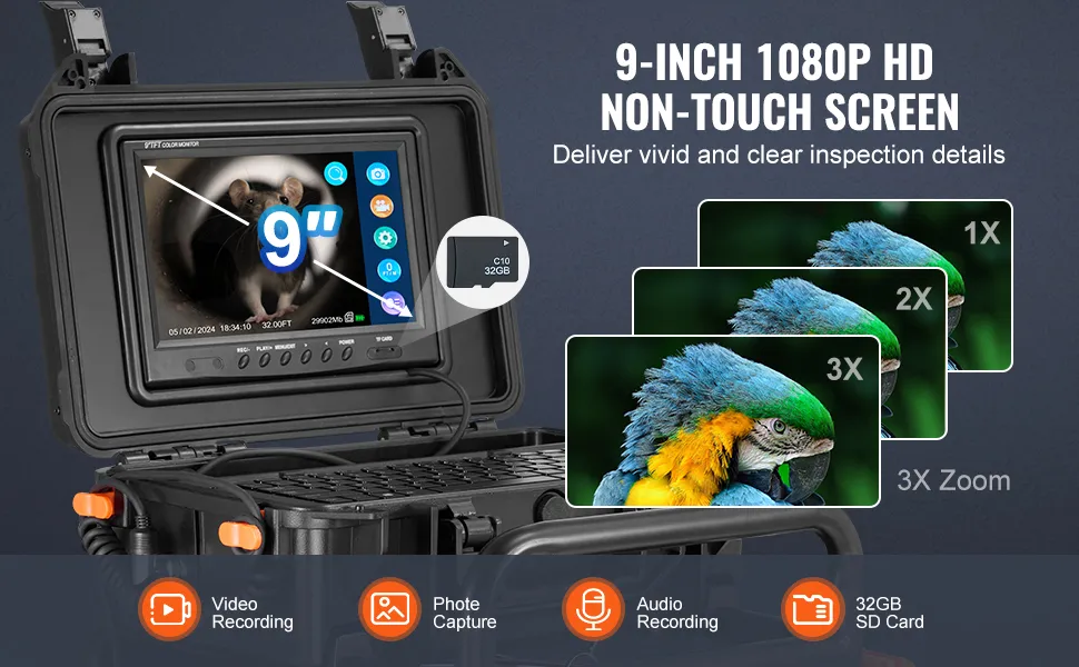 Profesjonalna kamera hydrauliczna wyposażona jest w 9-calowy ekran HD 1080P, który zapewnia ostry i wyraźny obraz, umożliwiając szczegółową inspekcję. Z łatwością uchwycisz każdy szczegół dzięki nagrywaniu wideo, robieniu zdjęć i 3-krotnemu zoomowi cyfrowemu.