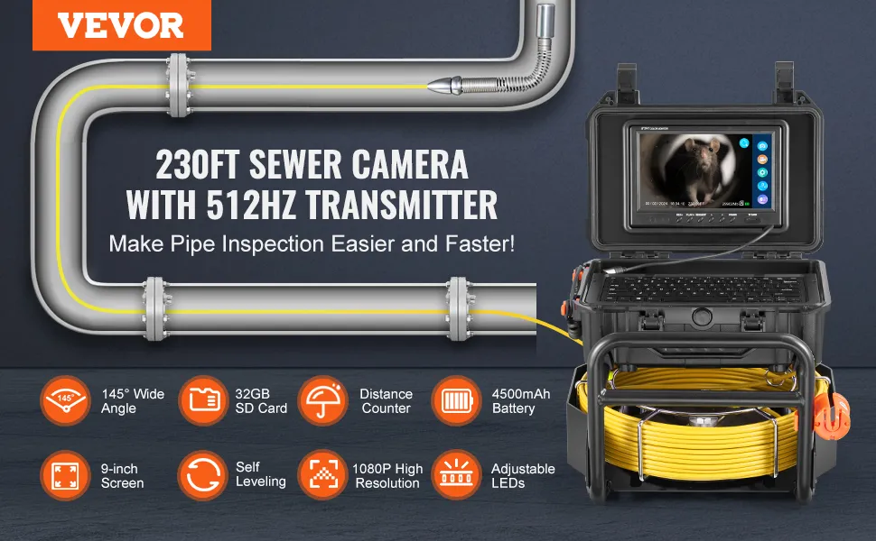 Kamera kanalizacyjna VEVOR 70 m, samopoziomująca kamera inspekcyjna do rur z nadajnikiem 512 Hz, licznikiem odległości, ekranem 9 cali, kamerą HD 1080P do rur z 12 diodami LED i kartą 32 GB do rur kanalizacyjnych, endoskopem