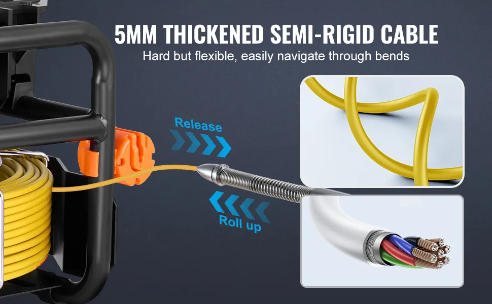 Półsztywny kabel wężowy o grubości 5 mm firmy VEVOR zapewnia większą trwałość i płynniejszą pracę, z łatwością pokonuje zakręty i sprawia, że inspekcje są bardziej wydajne.