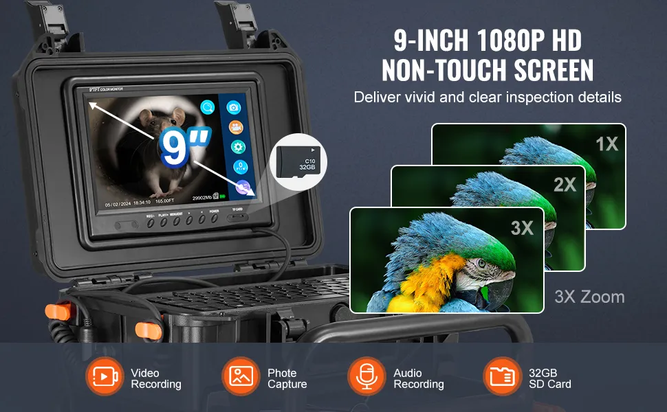 Profesjonalna kamera hydrauliczna wyposażona jest w 9-calowy ekran HD 1080P, który zapewnia ostry i wyraźny obraz, umożliwiając szczegółową inspekcję. Z łatwością uchwycisz każdy szczegół dzięki nagrywaniu wideo, robieniu zdjęć i 3-krotnemu zoomowi cyfrowemu.