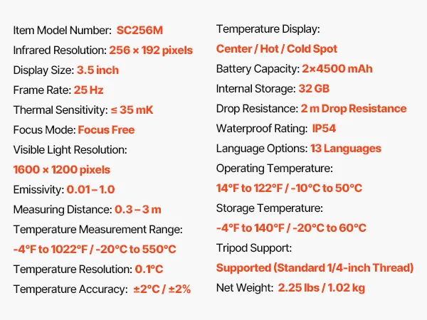 Wytrzymała i solidna: Nasza kamera termowizyjna jest zasilana dwoma akumulatorami o pojemności 4500 mAh i zapewnia długi czas pracy na baterii. Dzięki 32 GB wbudowanej pamięci, kamera przechowuje ponad 120 000 zdjęć i obsługuje zarówno zdjęcia, jak i nagrywanie filmów. Transmisja Wi-Fi i obsługa w 13 językach zapewniają dodatkową wygodę. Lekka, solidna konstrukcja wytrzymuje upadki z wysokości 2 m i spełnia normę wodoodporności IP54, dzięki czemu można ją dostosować do różnych warunków.