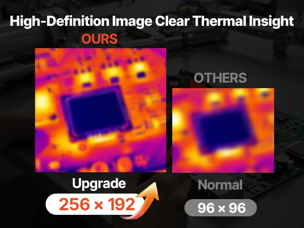 Kamera termowizyjna o wysokiej rozdzielczości: Wyposażona w kamerę światła widzialnego o rozdzielczości 2 MP i rozdzielczości IR 256 x 192 pikseli, nasza przenośna kamera termowizyjna zapewnia ostrzejsze obrazy, pozwalające wykrywać subtelne wahania temperatury. Dzięki polu widzenia 56° x 42°, częstotliwości odświeżania 25 Hz, czułości termicznej ≤35 mK, algorytmom wyostrzania obrazu i zaawansowanemu układowi AI, rejestruje ona szczegóły termiczne z wyjątkową ostrością.