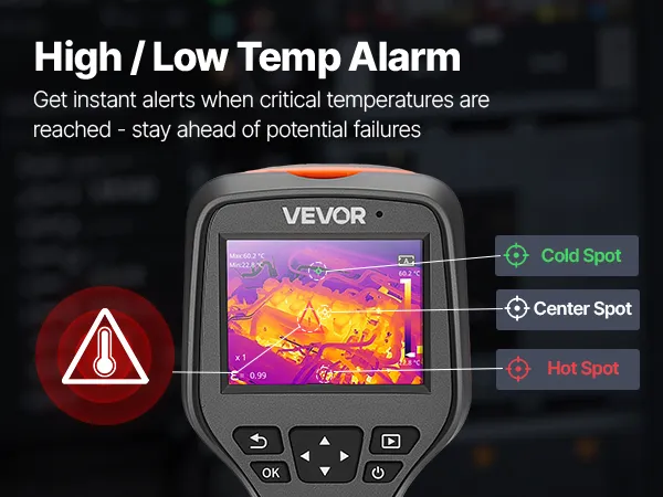 Szybkie wykrywanie anomalii: Ta kamera termowizyjna na podczerwień jest wyposażona w 3,5-calowy ekran dotykowy, który umożliwia natychmiastowe dodawanie notatek głosowych. Wyposażona jest w alarmy wysokiej/niskiej temperatury, które automatycznie monitorują odchylenia i generują alerty w czasie rzeczywistym, umożliwiając szybką identyfikację obszarów przegrzania lub schłodzenia. Precyzyjne wykrywanie anomalii temperatury pozwala szybko zidentyfikować usterki, takie jak przegrzanie urządzenia.