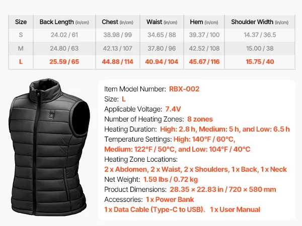 Ogrzewanie całego ciała: Kamizelka grzewcza posiada 8 stref grzewczych, obejmujących brzuch, talię, ramiona, plecy i szyję. Wbudowane elementy grzewcze z włókna węglowego zapewniają równomierne rozprowadzanie ciepła i szybkie nagrzewanie głównych partii ciała.