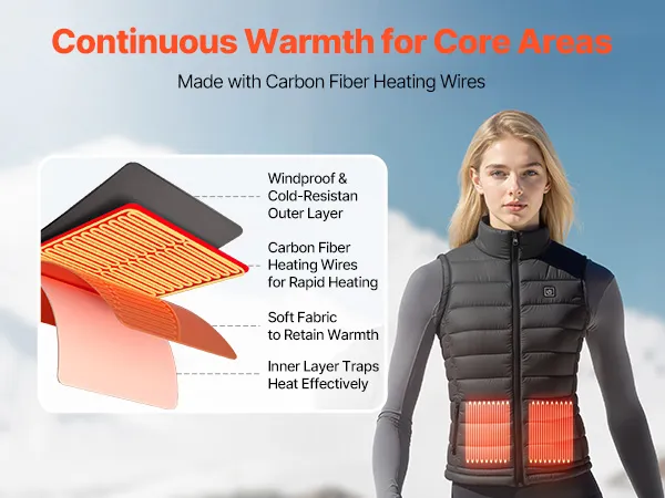 Dzięki wiatroszczelnej i odpornej na zimno warstwie zewnętrznej oraz wewnętrznej warstwie z włókien węglowych, ta ogrzewana kamizelka dla kobiet równomiernie rozprowadza ciepło i szybko się nagrzewa. Miękka tkanina termiczna zatrzymuje ciepło, zapewniając dodatkowe ciepło.