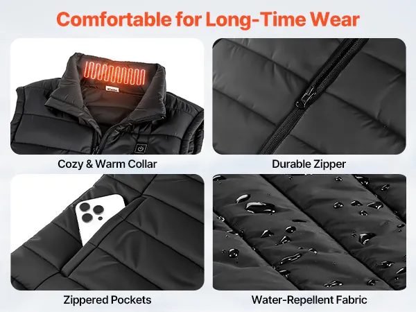 Wyposażona w wygodny kołnierz termiczny, gładki zamek błyskawiczny, wodoodporny materiał i kieszenie zapinane na zamek, ta ogrzewana kamizelka zwiększa komfort i praktyczność podczas aktywności na świeżym powietrzu.