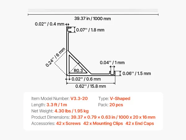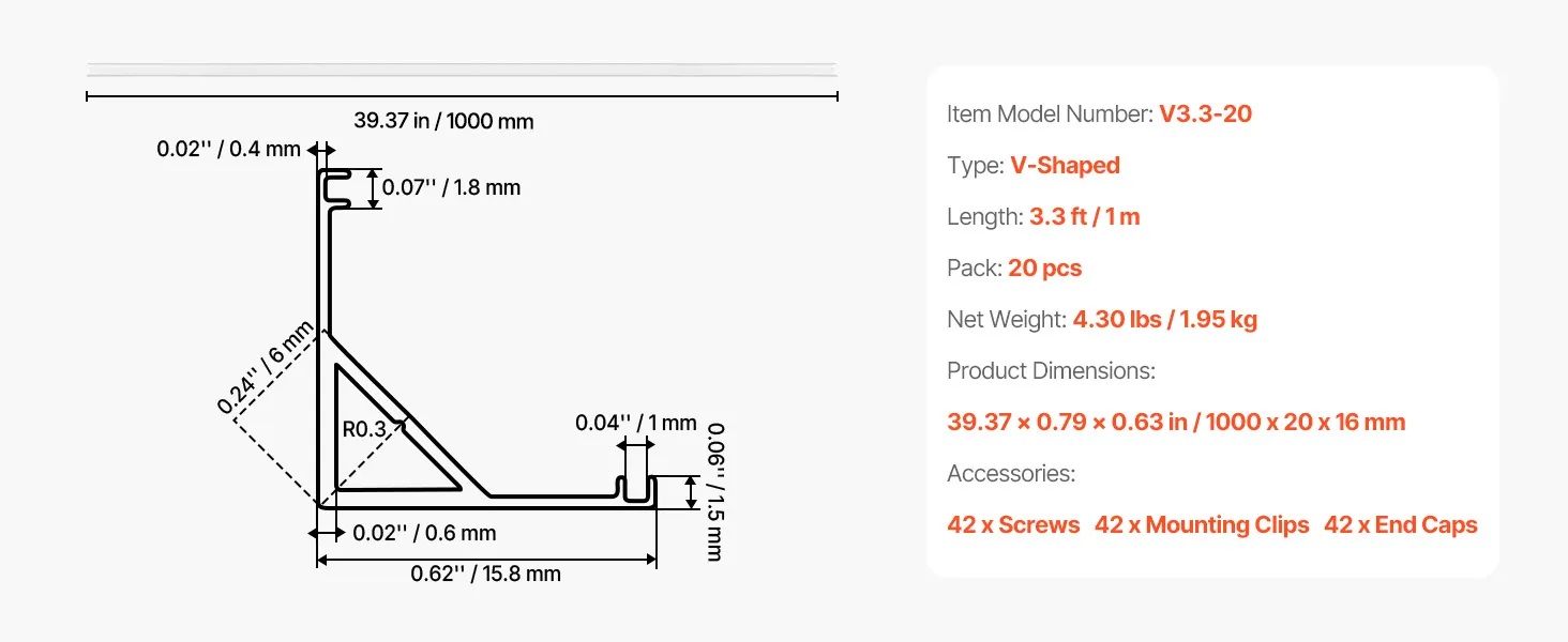 Profile LED VEVOR, 20 szt., 1 m, anodowane profile aluminiowe z mleczną osłoną, zaślepki i klipsy montażowe, kanały, dyfuzor do taśm LED, idealne do blatów podszafkowych, kształt litery V