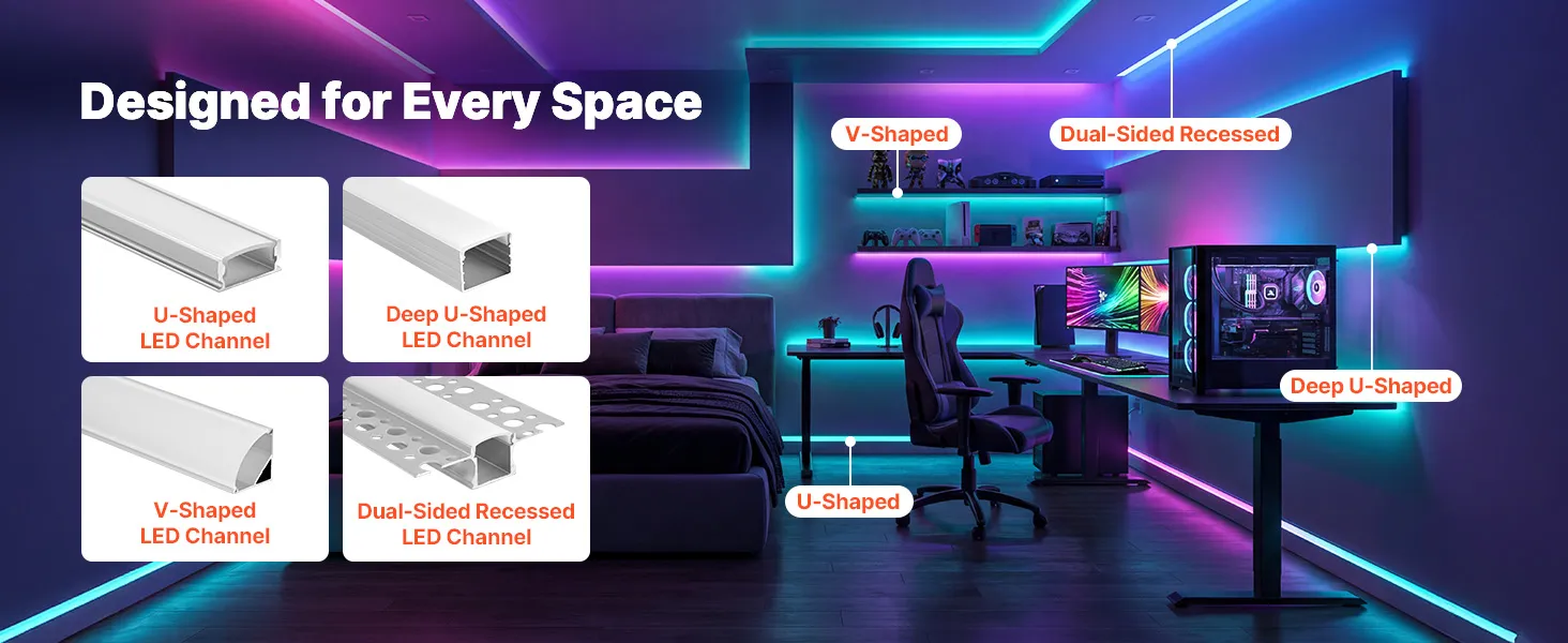 Ten system kanałów świetlnych LED obejmuje profile w kształcie litery U, głębokie profile w kształcie litery U, profile w kształcie litery V oraz profile wpuszczane dwustronne, które spełniają różne efekty świetlne i wymagania instalacyjne w ramach jednego kompletnego rozwiązania.