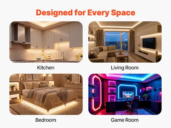Ta taśma świetlna LED idealnie sprawdzi się w kuchniach, salonach, pokojach zabaw i sypialniach, pozwalając z łatwością stworzyć jasną, przytulną i stylową atmosferę w każdym pomieszczeniu domu.
