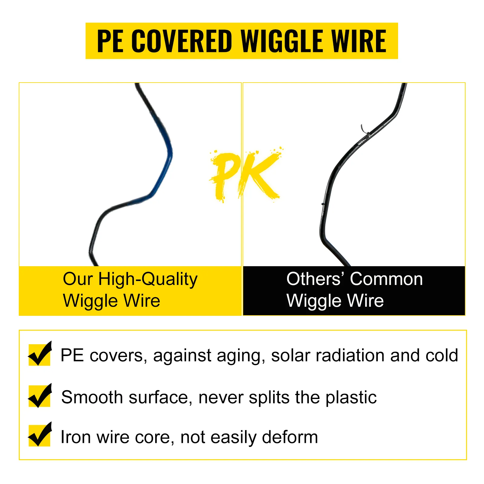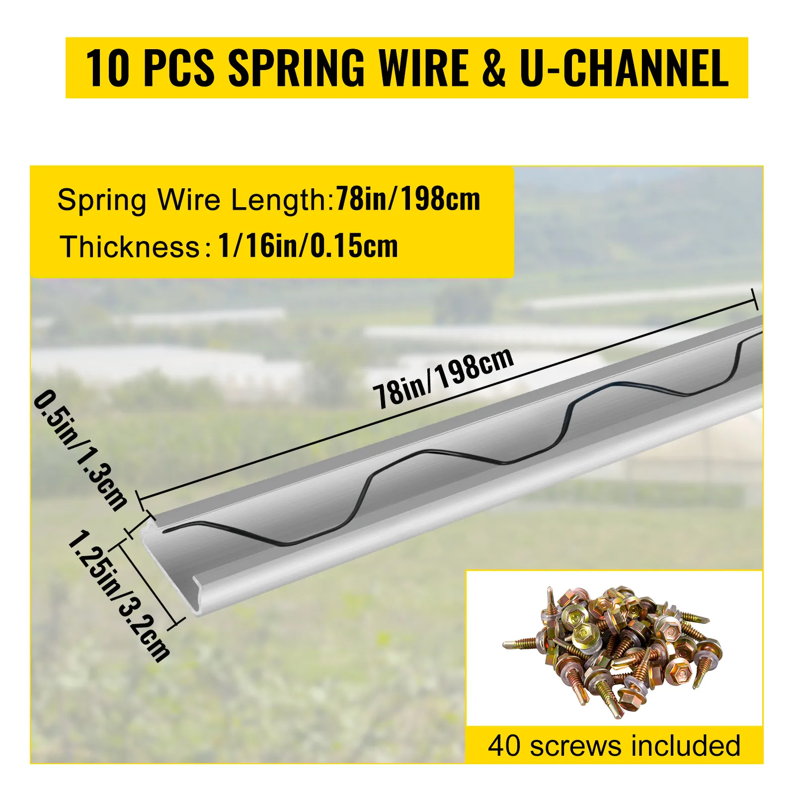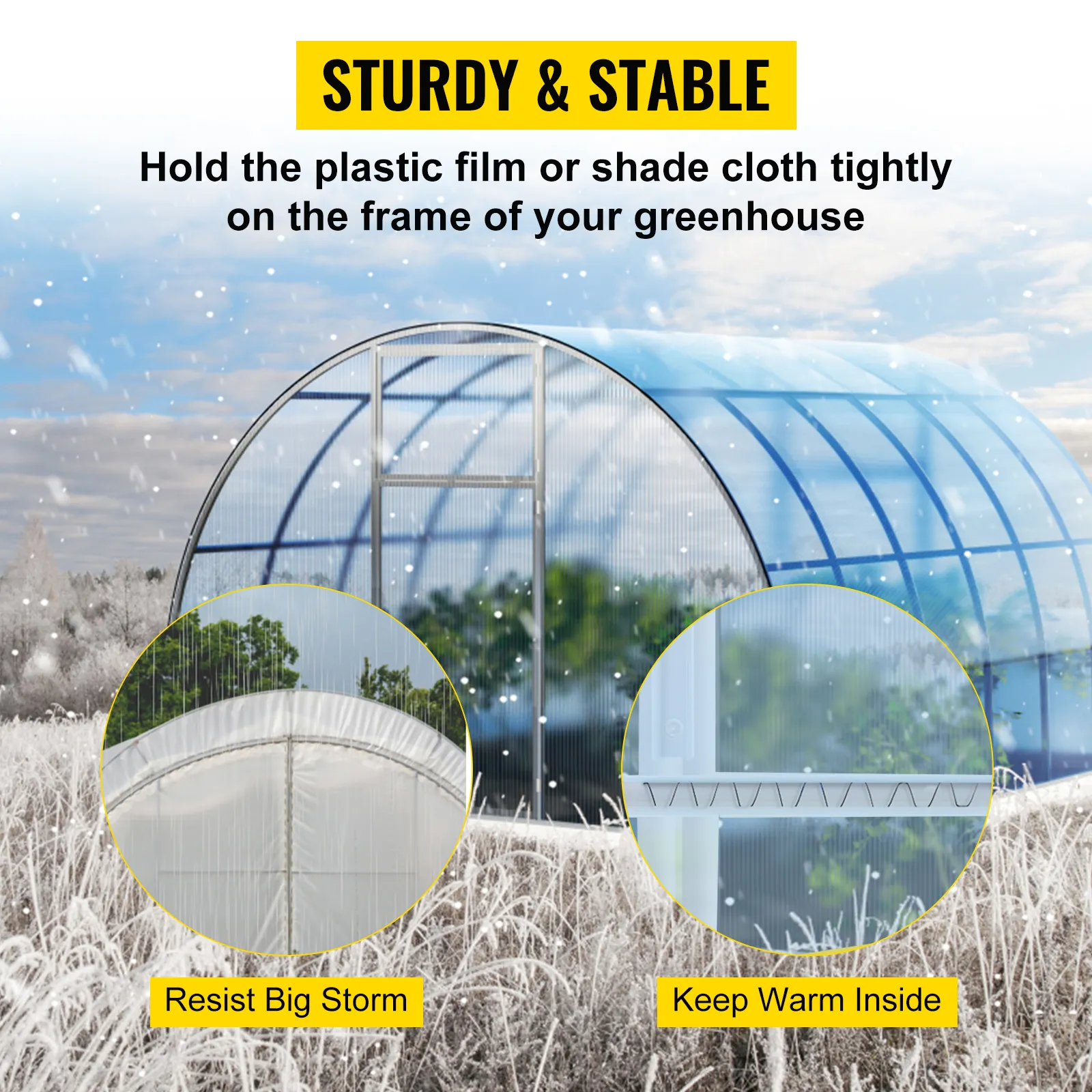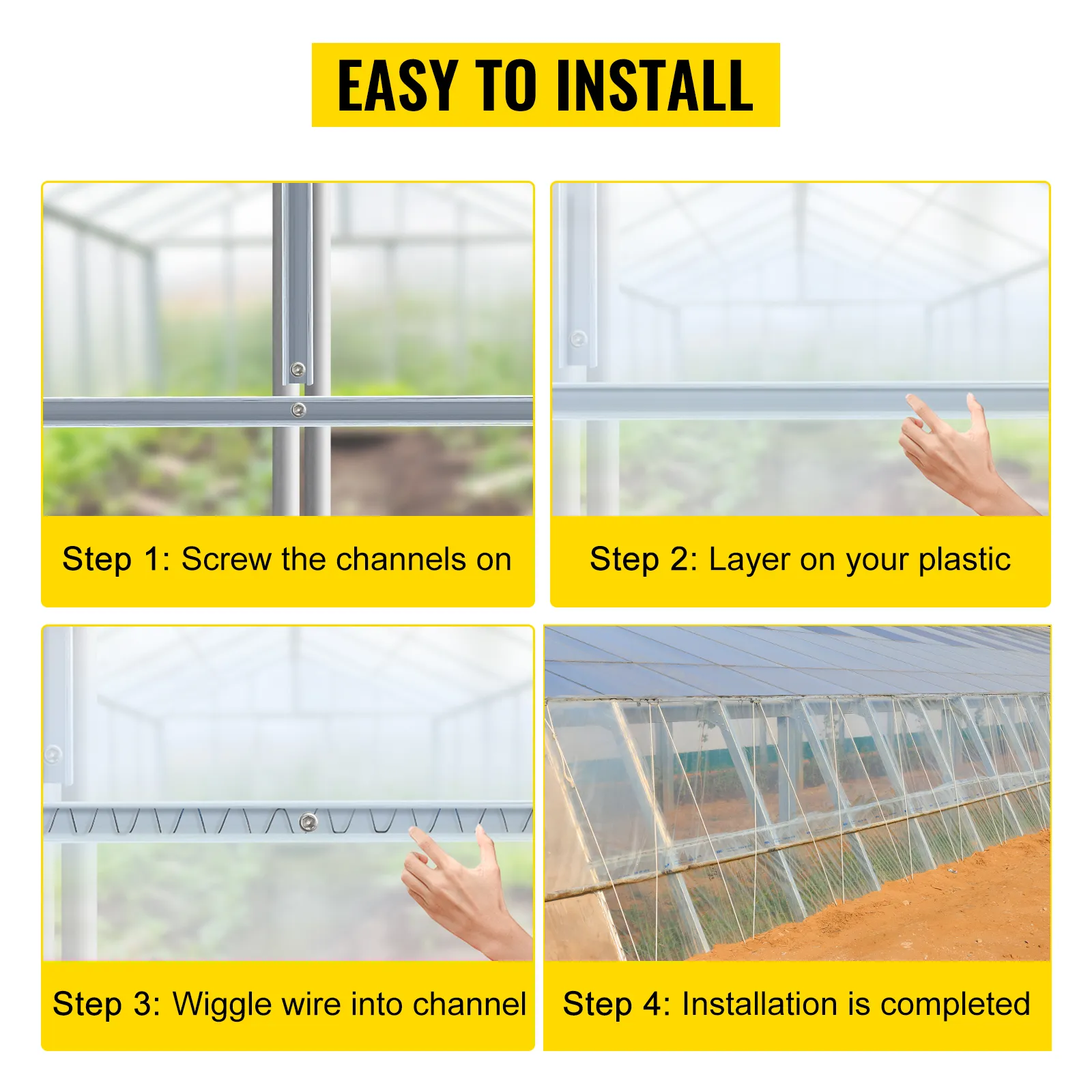 Kanał blokujący wykonany jest ze stopu aluminium, a drut sprężynowy wykonany jest z wysokiej jakości żelaznego rdzenia i osłony PE, które są mocne i trwałe oraz doskonale do siebie pasują. Możesz mocno przymocować plastik, aby wytrzymać burzę i utrzymać ciepło w szklarni. Są wszechstronne.
