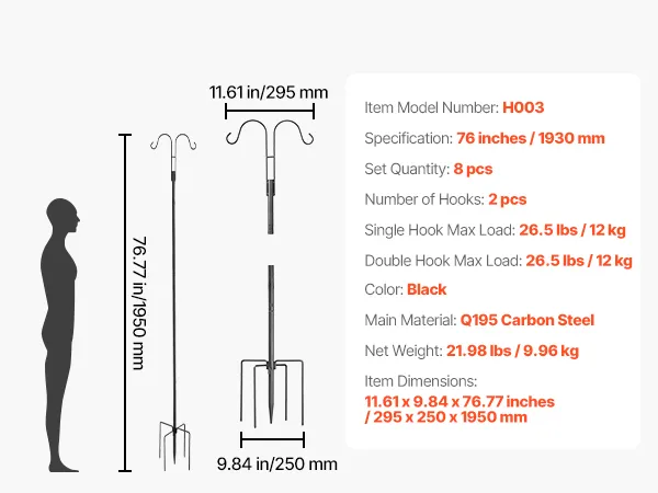 Haki pasterskie VEVOR, 8 szt., haki pasterskie 195 cm, podwójny hak ogrodowy na maszt do latarni, haki ogrodowe o grubości 1,9 cm do wieszania karmników dla kolibrów, doniczek na rośliny, latarenek solarnych, dzwonków wietrznych