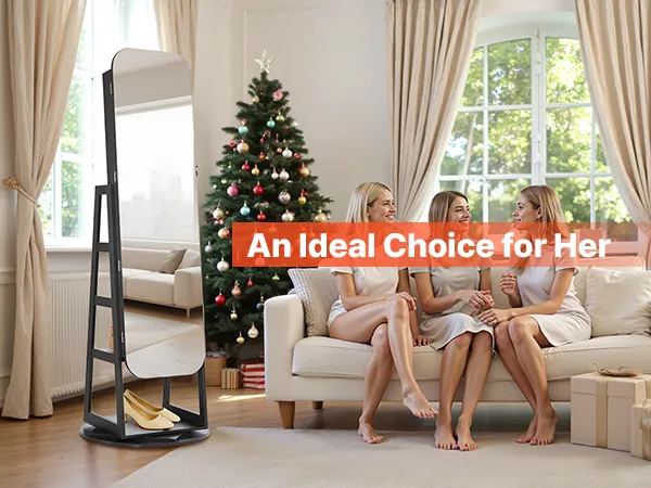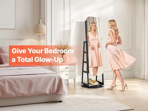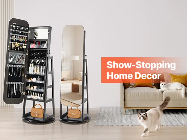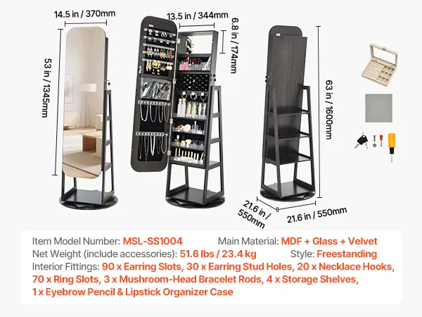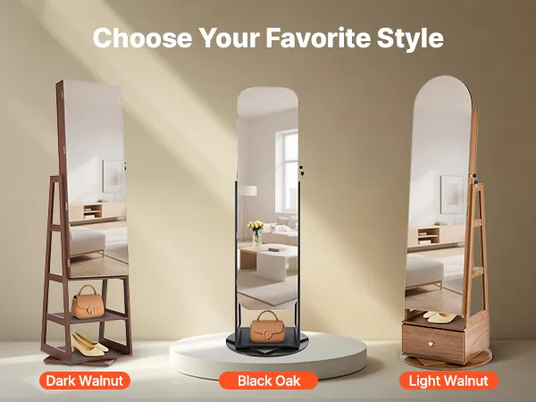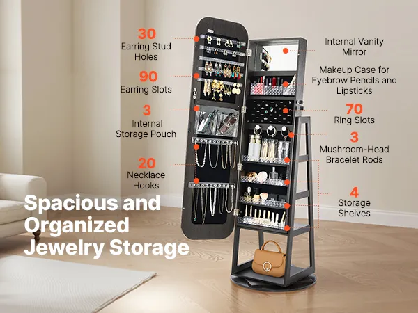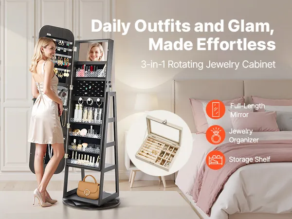 Funkcjonalny design 3 w 1: To coś więcej niż tylko szafka na biżuterię – to obrotowe lustro na biżuterię to lustro o pełnej długości, obracające się o 360° i zintegrowane z lustrem do makijażu. Przechowuj buty i torebki poniżej, aby mieć pod ręką swój strój i wyglądać pewnie na każdą okazję.