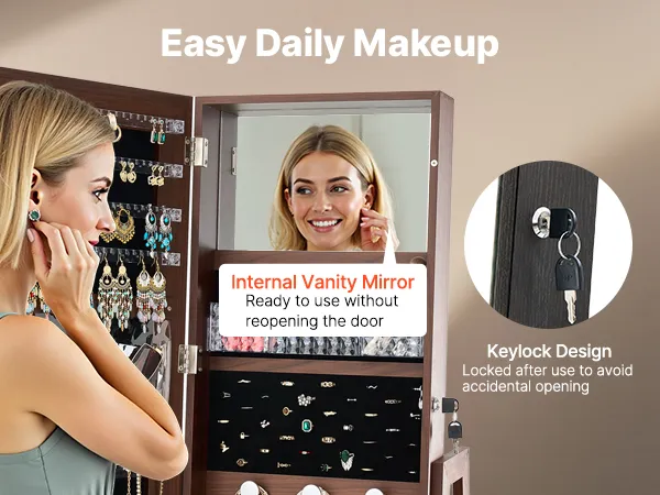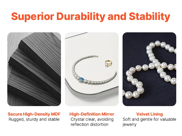 Wysokiej jakości materiały: To stojące lustro z miejscem do przechowywania wykonane jest z wytrzymałego drewna konstrukcyjnego o gramaturze 44,9 funta/stopę³, dzięki czemu jest trwałe, odporne na zużycie i stabilne. Miękka, pluszowa wyściółka chroni biżuterię, a wysokiej jakości szklane lustro lśni jak nowe po umyciu.