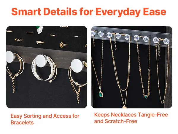 Stojące lustro z miejscem do przechowywania wyposażone jest w haczyki na naszyjniki, dzięki czemu naszyjniki będą uporządkowane i nie będą się plątać.